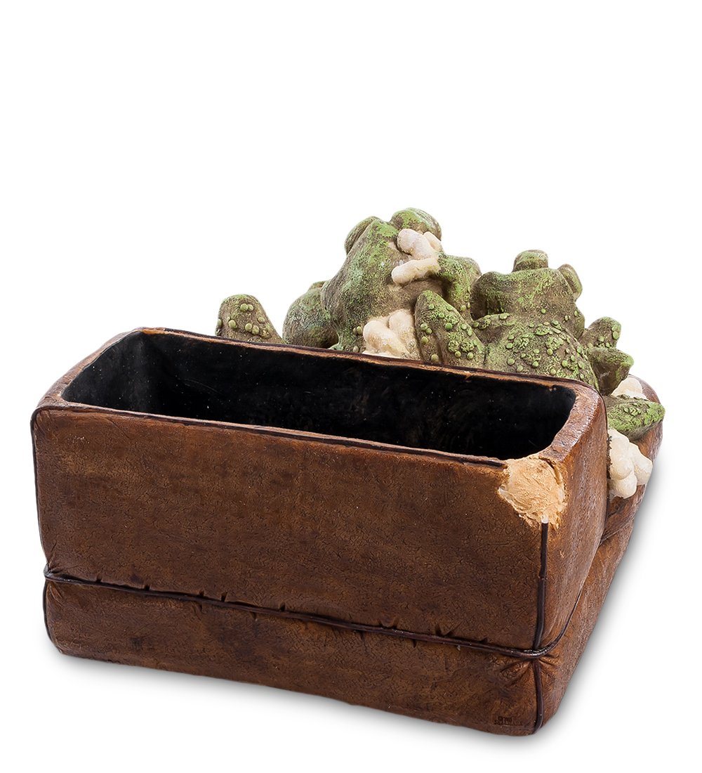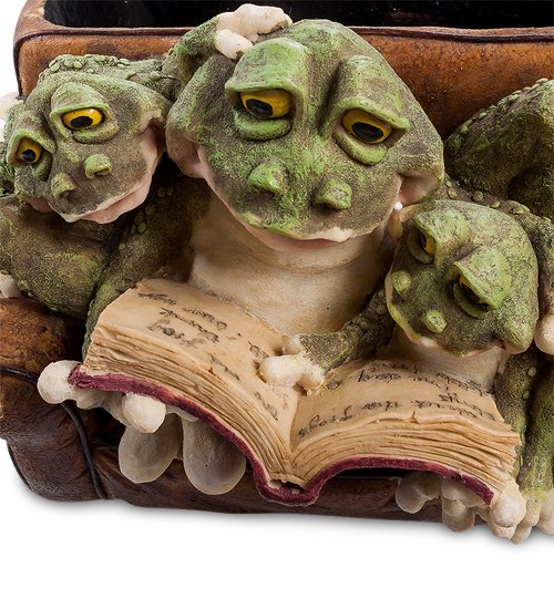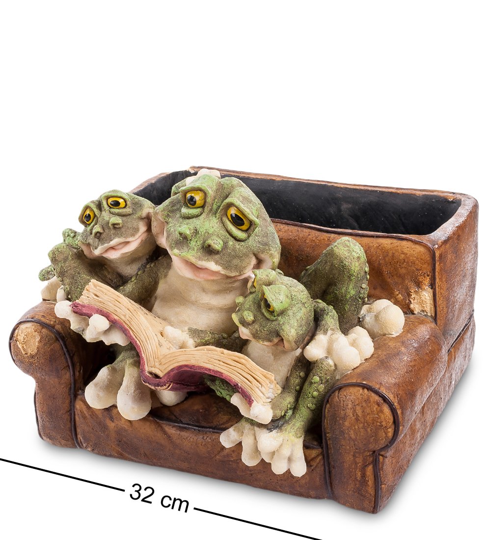 Кашпо «Лягушка в кресле» станет лучшим подарком для всех любителей оригинальных и стильных вещей. Изделие выполнено в виде кресла, спинка которого предназначена для расположения цветочных горшков или поддонов. На кресле обитает симпатичная семья лягушек – мама и двое маленьких деток. Мама-лягушка читает своим малышам волшебные сказки из старинной книги, что наполняет композицию домашней идиллией и добродушием.