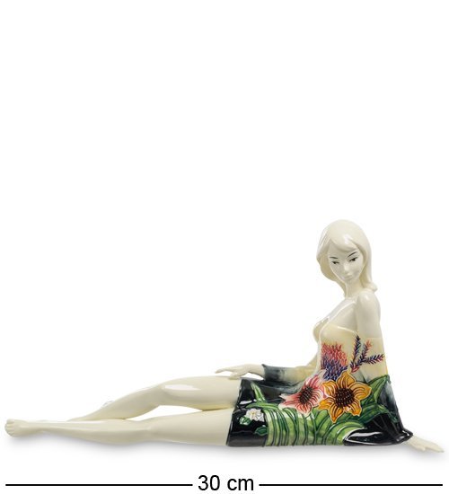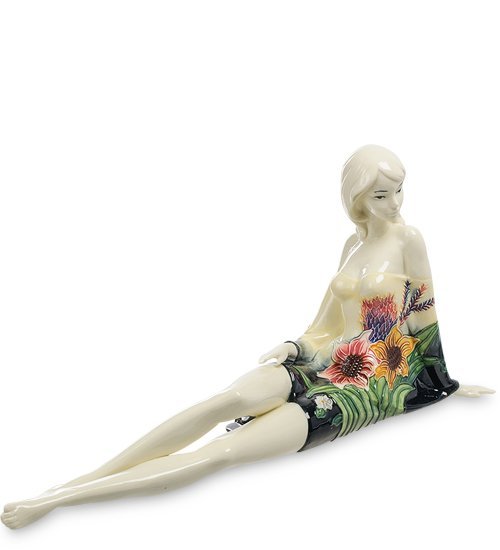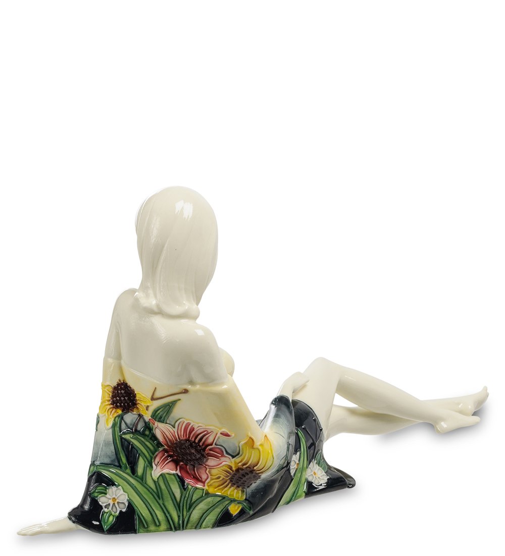 Фарфоровая девушка, изгибы которой притягивают взгляд. Линии её тела передают чувства гармонии и женского волшебства. Барышня словно присела на минутку, оказавшись на прекрасном цветущем лугу. Присмотревшись, мы замечаем, что цветы и листья изображены на её коротком платье. С большим мастерством передан заинтересованный и в то же время удивлённый взгляд. Она словно наблюдает с дружелюбным интересом за тем, что происходит у вас дома.