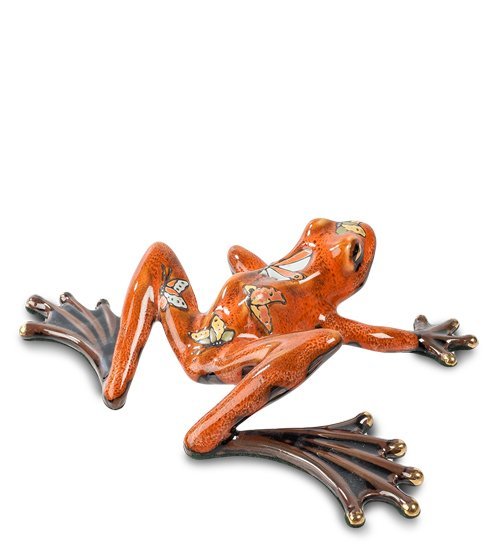 Симпатичная фигурка «Лягушка» имеет нестандартный для земноводных оттенок. Лягушка выполнена в бордовом цвете и у неё на спине и голове имеются декоративные элементы в виде небольших бабочек. Лапы лягушки достаточно большие, а кончики покрыты золотым напылением.