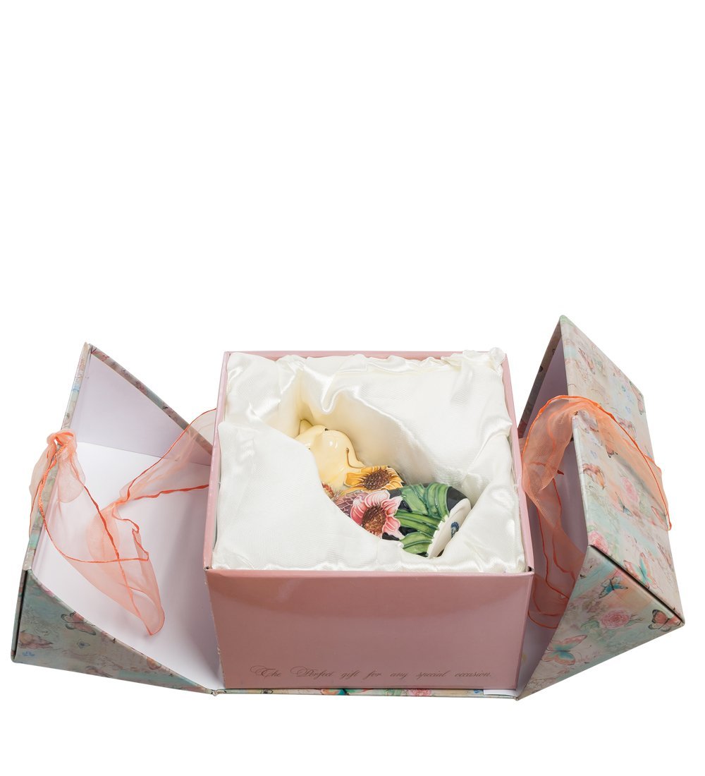 Нежно-кремовая кошка смотрит свысока, осознает свое великолепие и ее самолюбие вполне мотивировано, чего только стоит рельефный цветочный рисунок, которым мастер заботливо украсил тело этого милого, но своенравного создания. Яркие летние цветы распустились, будто по взмаху волшебной палочки, или, скорее, кисти. Растительность буйствует и переплетается между собой, создавая атмосферу лета и праздника.