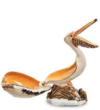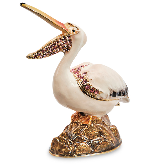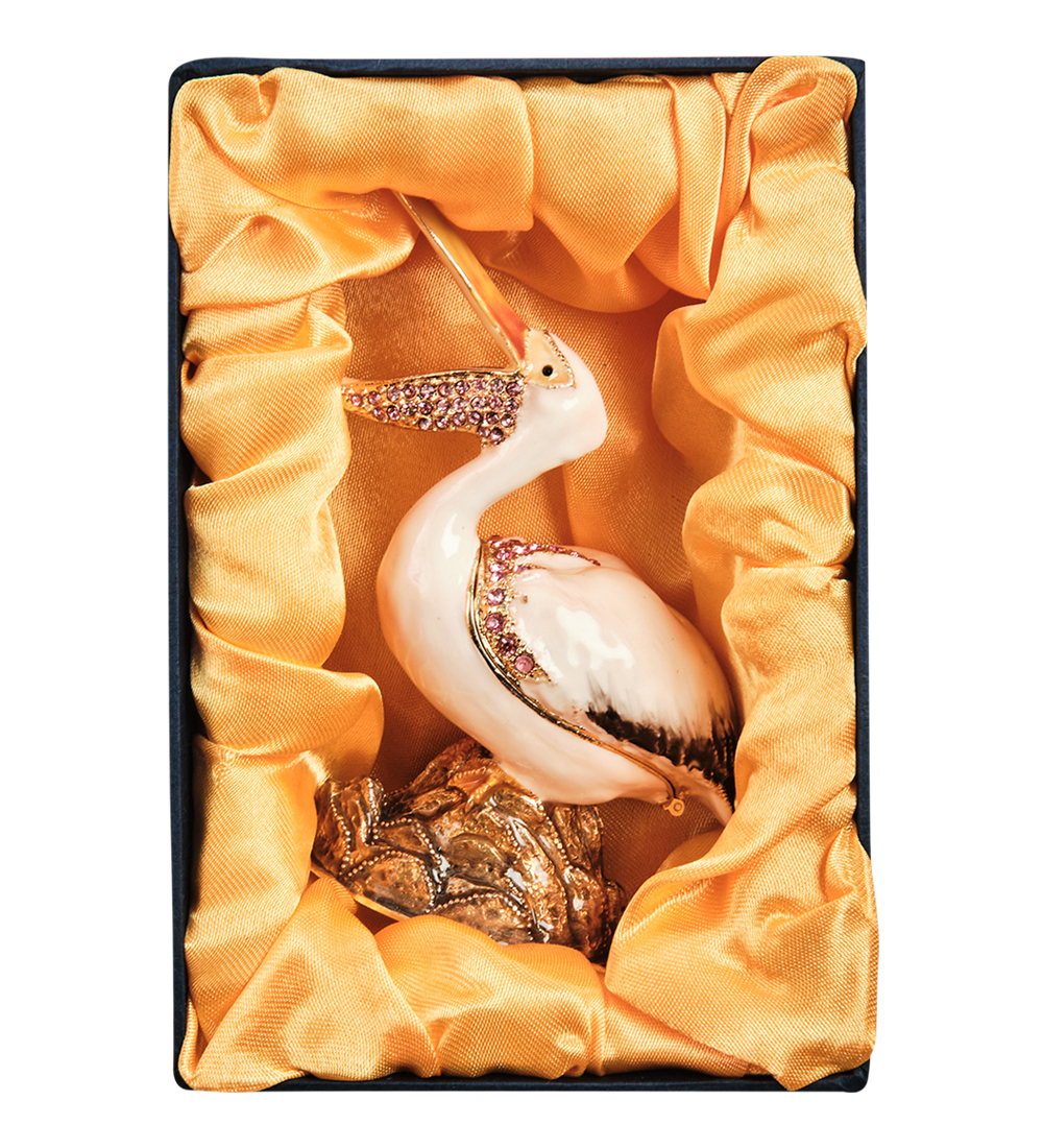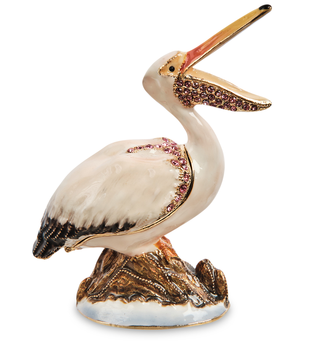 Пеликан широко разинул свой огромный клюв – то ли рыбы требует, то ли просто кричит. Птица удивительно красива, мешок под клювом и часть спины отделаны мелкими кристалликами. Но главные ценности пеликан скрывает внутри, под поверхностью откидной крышки-спины. Что вы будете хранить в этой удивительно красивой шкатулке? Драгоценности или повседневную бижутерию?