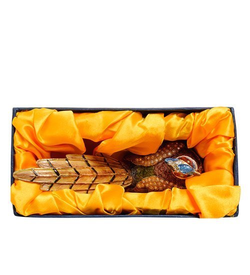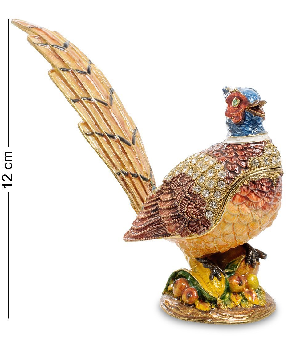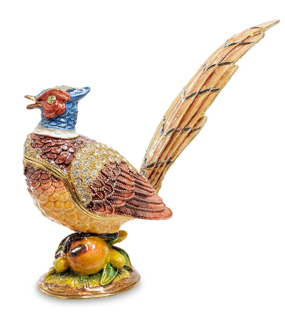 Фазан – самая красивая птица в наших краях. Бежевый пестрый хвост, коричневые крылья, синяя головка и красные пятна вокруг глаз. Да еще и украшен этот фазан россыпью мелких кристалликов. Приятная яркая безделушка, украшение туалетного столика.