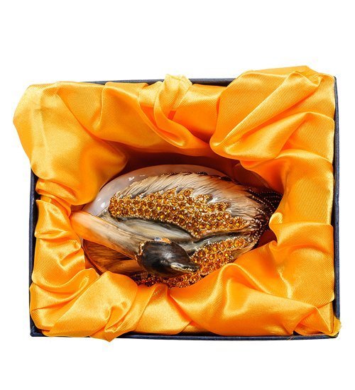 Маленькая фигурка пеликана, величественно плывущего по водной глади, богато отделана узорами из мельчайшего бисера. А по спине этот узор выполнен из золота. Не птица, а драгоценность, достойное украшение, да к тому же и полезное, имеющее прикладное значение.