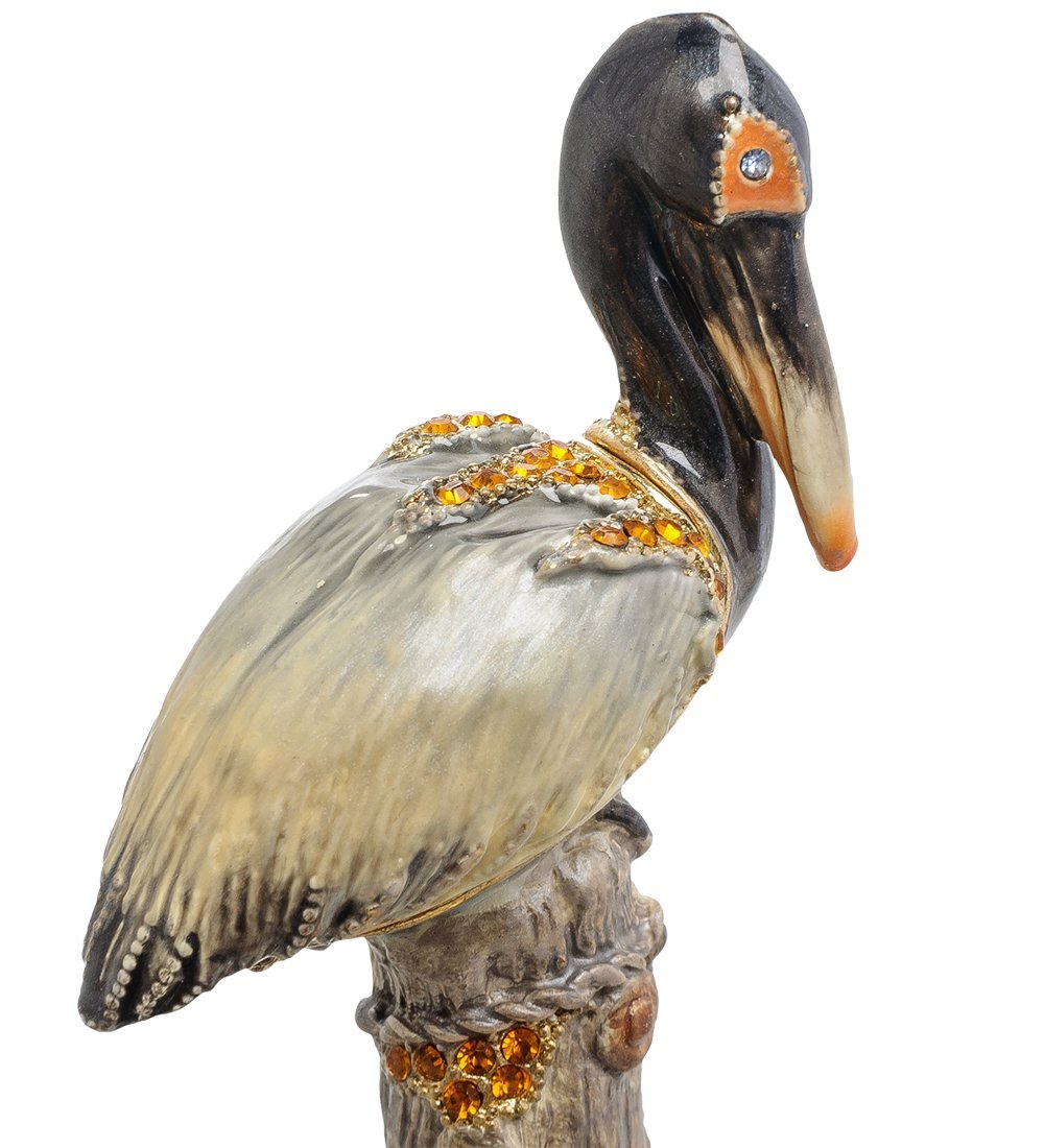Но главная тайна хранится внутри – спинка птицы откидывается на петельке и открывает пространство миниатюрной шкатулочки. В нее можно пару мелких украшений положить, чтобы всегда под рукой были, а можно использовать всю эту композицию в качестве держателя для визиток. Это уж смотря кому такой красавец-пеликан достанется – бизнесмену или его супруге.