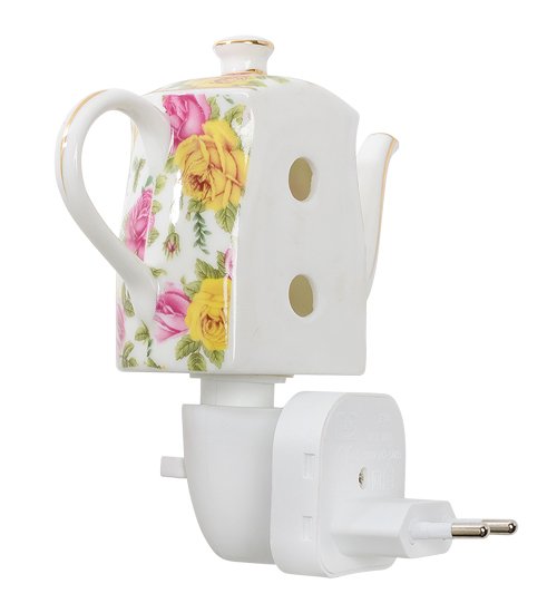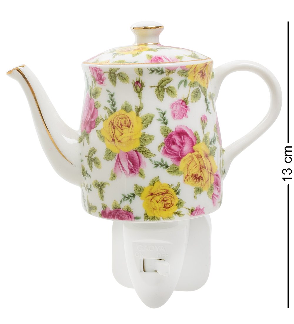 Светильник высотой 13 см. Фарфоровый светильник в виде чайника – это особенный предмет для освещения помещения. Если не замечать вилку, то такое изделие может пополнить коллекцию посуды на кухне. Оригинальность светильника не только в интересном дизайне с пышными розами, но и в том, что он сильно напоминает настоящий и вот-вот с его носика пойдёт пар от свежезаваренного чая.