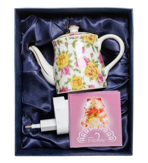 Чайник почти ничем не отличается от подобных изделий, даже присутствует крышка. В дизайне используются крупные декоративные элементы в виде малиновых и желтых роз. Качественный фарфор превращает изделие в великолепный подарок, который будет уместен к любому празднику друзьям или родственникам. Используя такой светильник, можно создать особенную атмосферу за ужином или поставить его в детскую комнату.