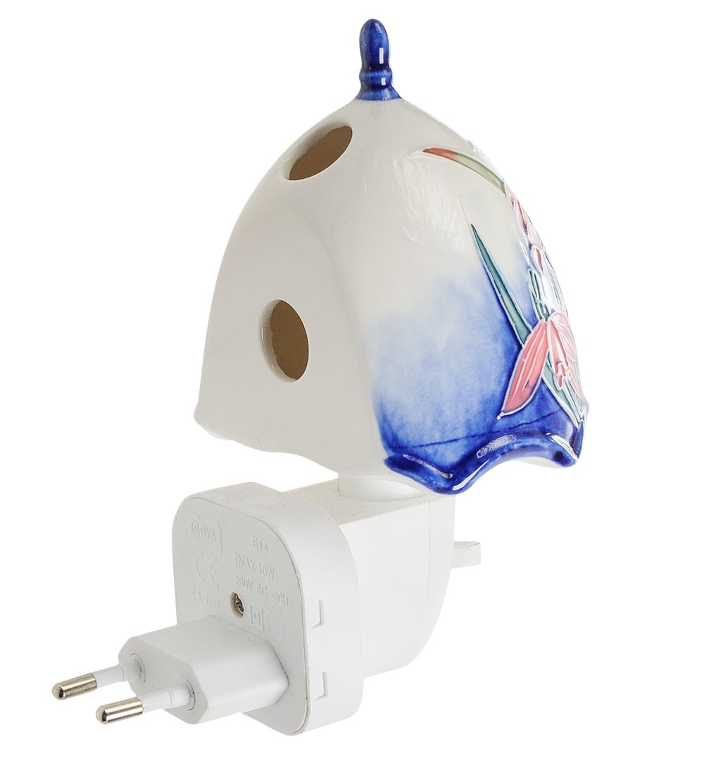 Компактный светильник, имеющий простую и удобную конструкцию. Удобная вилка для включения в бытовую электросеть, патрон для лампочки и фарфоровый абажур, украшенный росписью вручную. Сюжетом для изображений стал цветущий сад, цветы и листья, нарисованные на фарфоре, покрыты слоем прозрачной глазури.