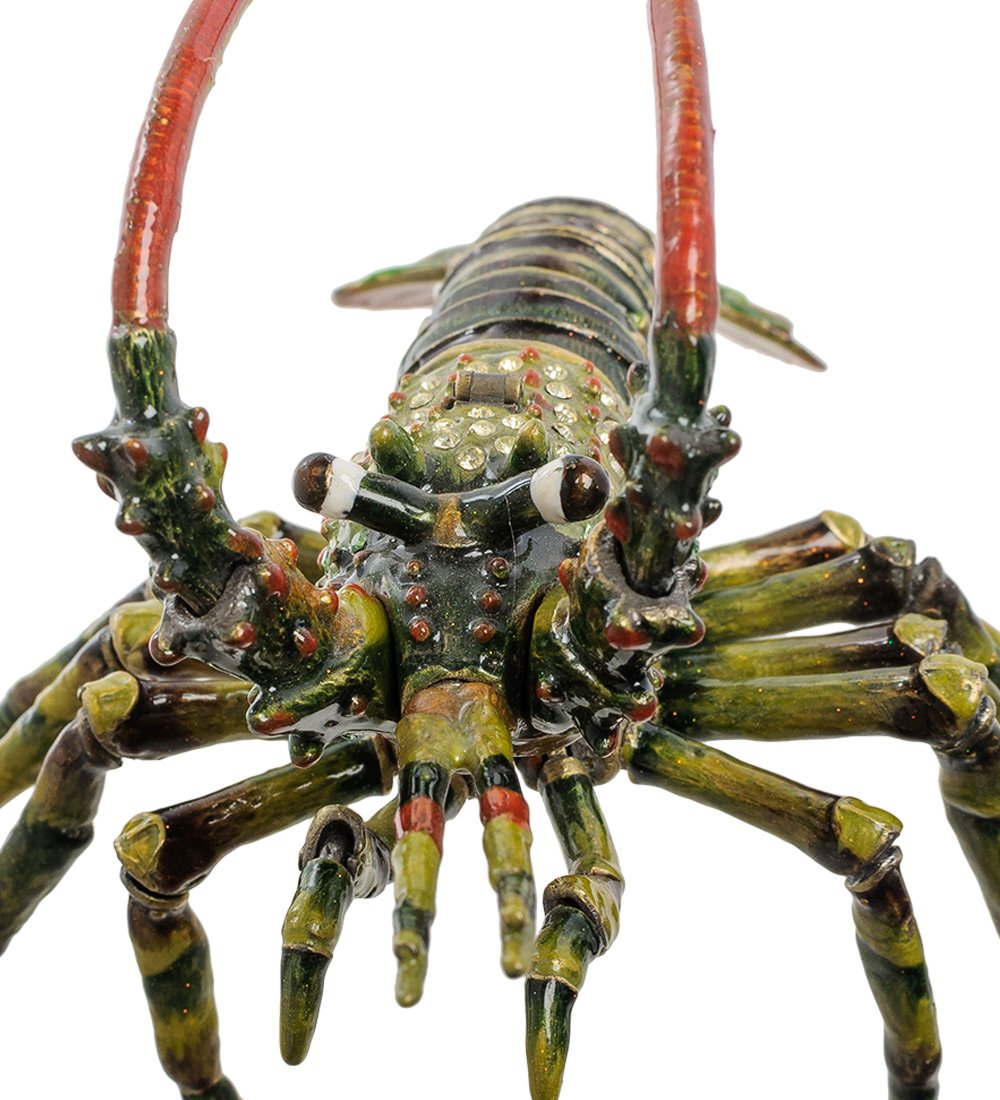 Присмотритесь – это не наш речной рак. Нет клешней, ноги полосатые, усы окрашены в красный цвет, рядом с глазами на стебельках растут маленькие рожки – это обитатель тропических морей, лобстер, известный деликатес. Но этого рака есть нельзя: он металлический.