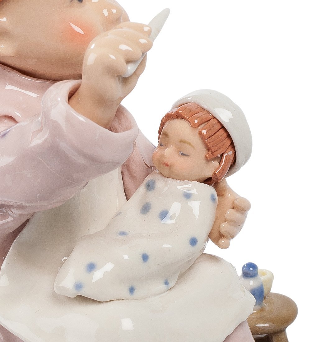 Крохотная девочка и вправду чувствует себя не очень (хотя возможно, она просто крепко спит). Забавная фарфоровая статуэтка «Юный доктор» понравится студентам медицинских вузов, а также опытным докторам с хорошим чувством юмора.