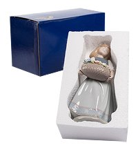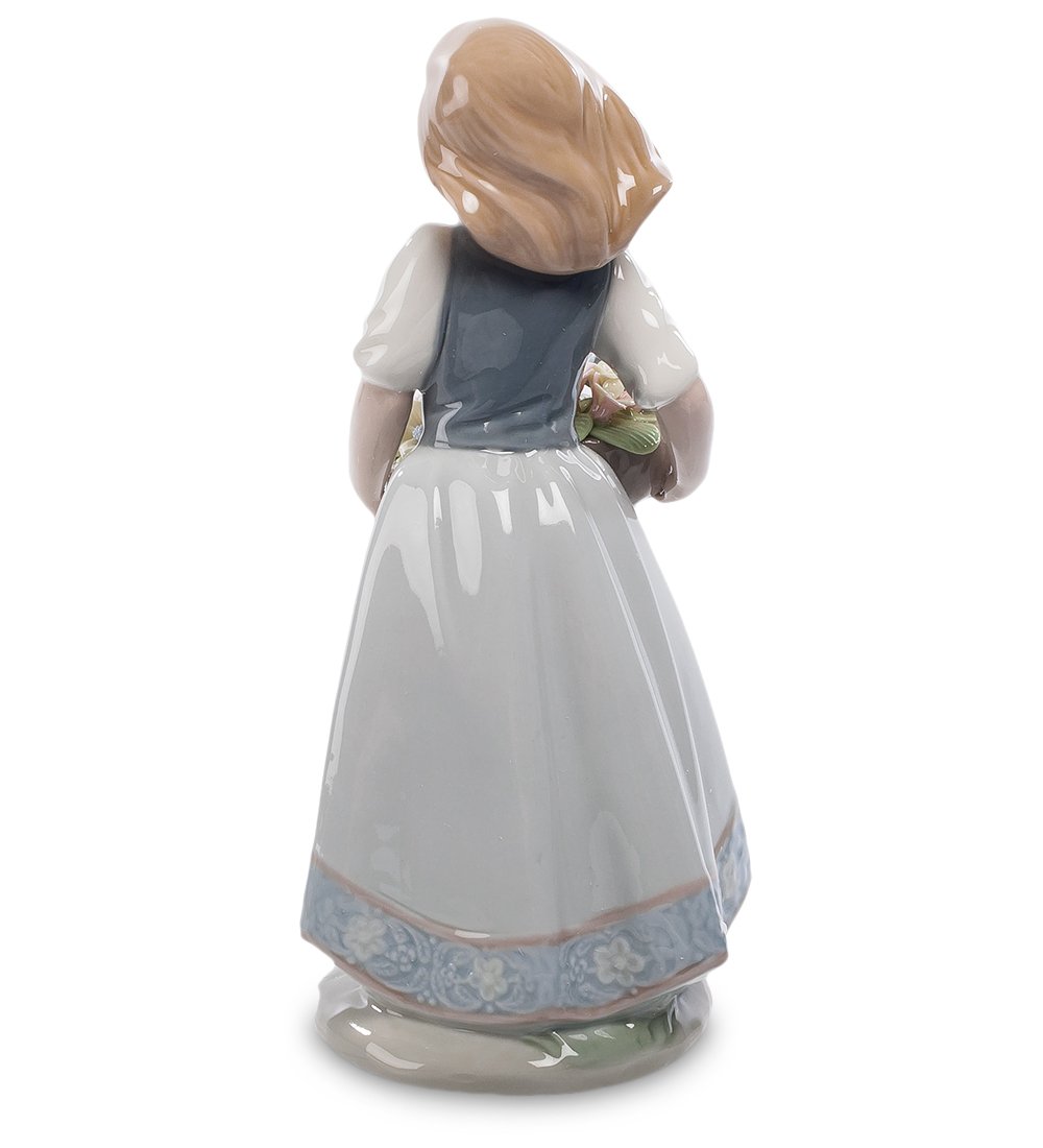 Красота и нежность переплелись в этом милом изделии, а благодаря легким пастельным оттенкам фигурка кажется изящной . Художники превосходно справились и с расстановкой акцентов, глубокий фиолетовый на платье девочки служит центральным цветовым элементом композиции, а нежный голубой лепестков в корзинке будто бы поигрывает своему более насыщенному партнеру.