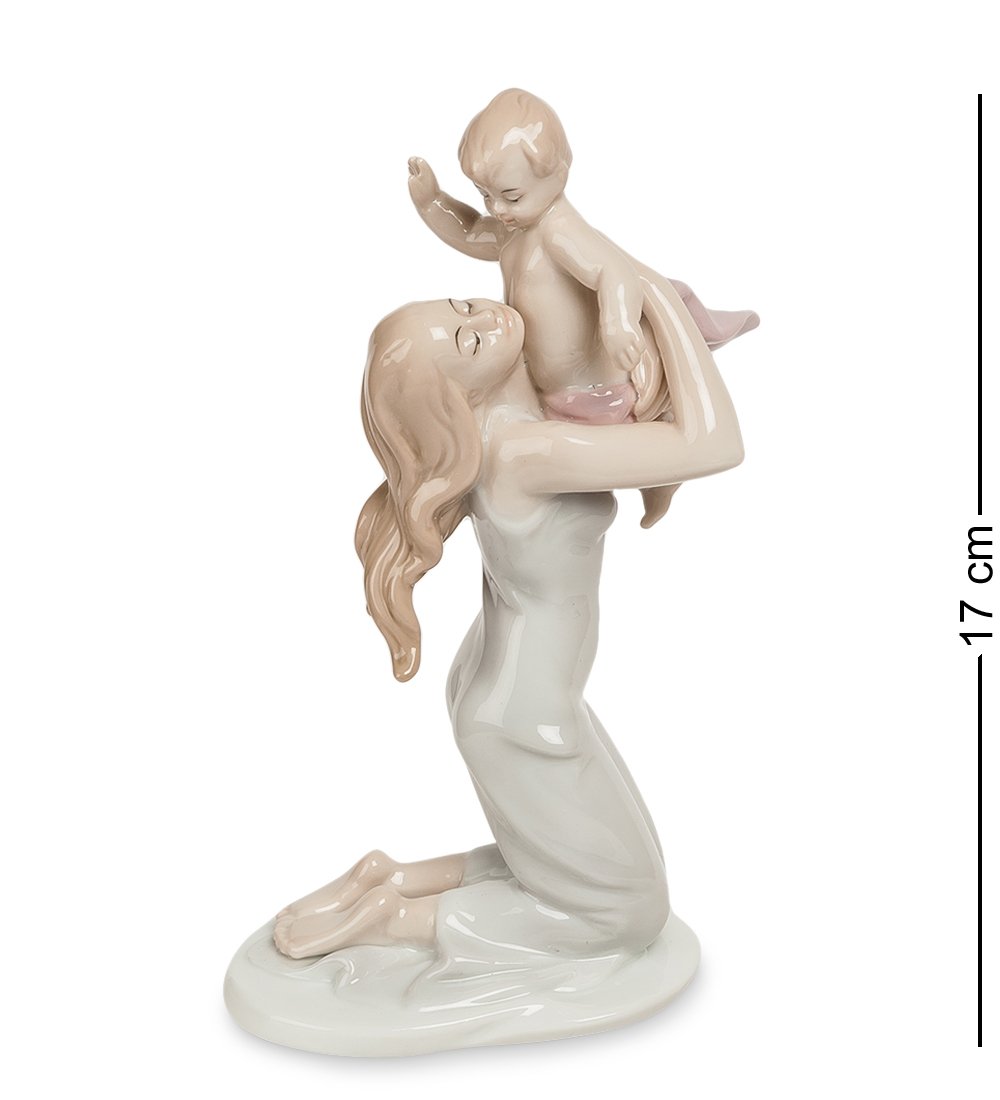 Одну из счастливых мам изобразили создатели фарфоровой статуэтки «Девушка с ребенком». Девушка одета в светло-серое платье, стоит на коленях и держит на руках малыша, завернутого в розовое полотенце. Мама прижимает ребенка к груди, и оба они выглядят очень счастливыми.