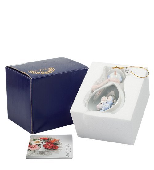 Изделие расписано нежными пастельными красками и покрыто перламутровым блеском, из-за чего кажется, будто бы оно искрится словно новогодний снег.