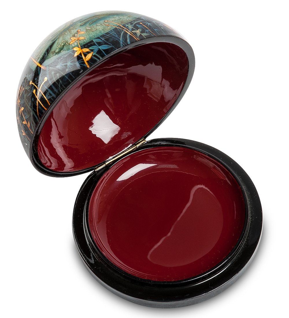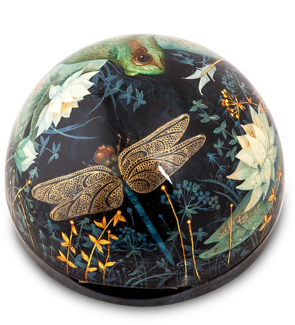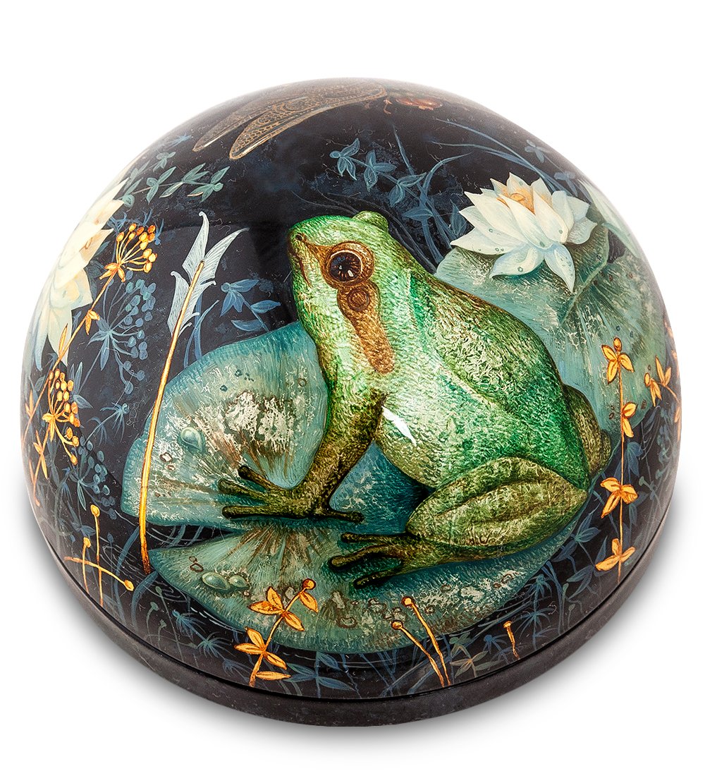 Жители азиатского региона полагают, что лягушка притягивает положительную энергетику, и, если расположить жабу в соответствии с требованиями фен-шуй, она будет приносить удачу и обогащать владельца. Для тех, кто верит в лучшее и не прочь приютить зеленое существо дома, художница Качалкина раскрасила шкатулку «Лягушка удачи».