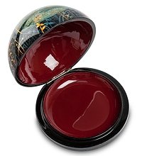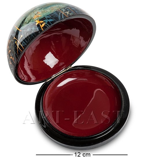 Диаметр коробочки - 12 сантиметров; она имеет круглую форму, а крышка с изображением земноводного – форму полушария.
