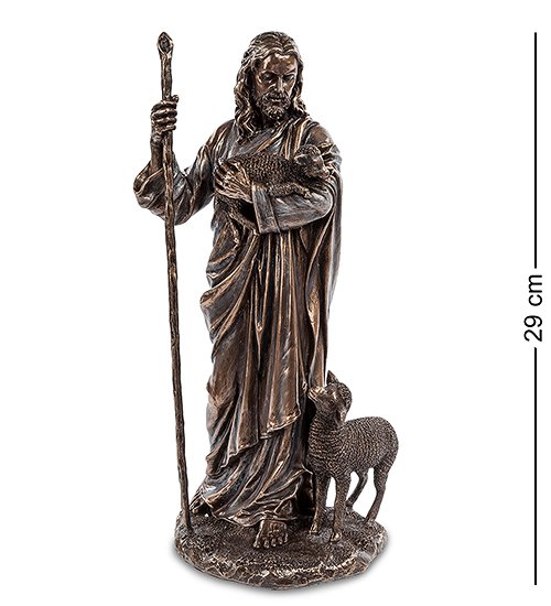 Статуэтка взрослого Иисуса с маленьким ягненком на руках и посохом выполнена из полистоуна. Особенное внимание уделяется деталям. Взрослый мужчина склоняет голову над беззащитным маленьким животным, которое нуждается в заботе и тепле. Он часто говорил, что жизнь свою он полагает на овец, а символичная сцена означает, что Господь может спасать, как животных, так и людей.