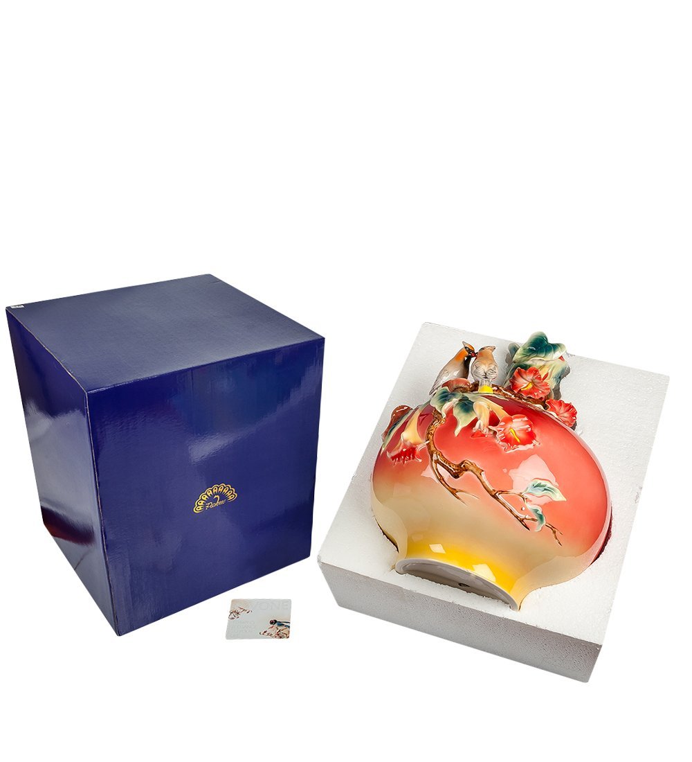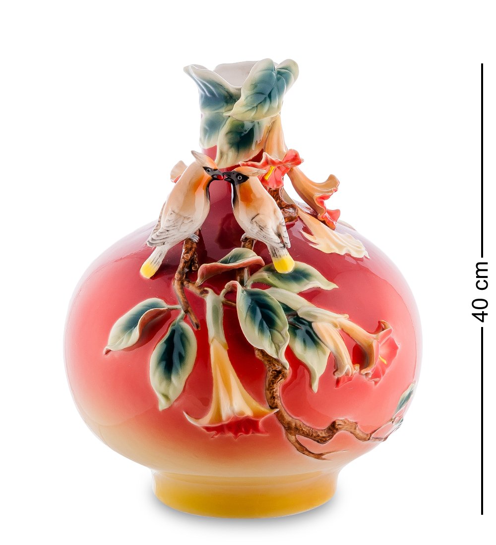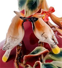 Однако апофеоз красоты этого изделия проявляется в нежно воркующих птицах, которые обитают между ароматными бутонами и наполняют композицию своей любовью. Отдельное восхищение вызывает цветовая гамма вазы: розовые, желтые, оранжевые, синие и зеленые оттенки плавно перетекают друг в друга, делая вазу необычайно гармоничным интерьерным украшением.