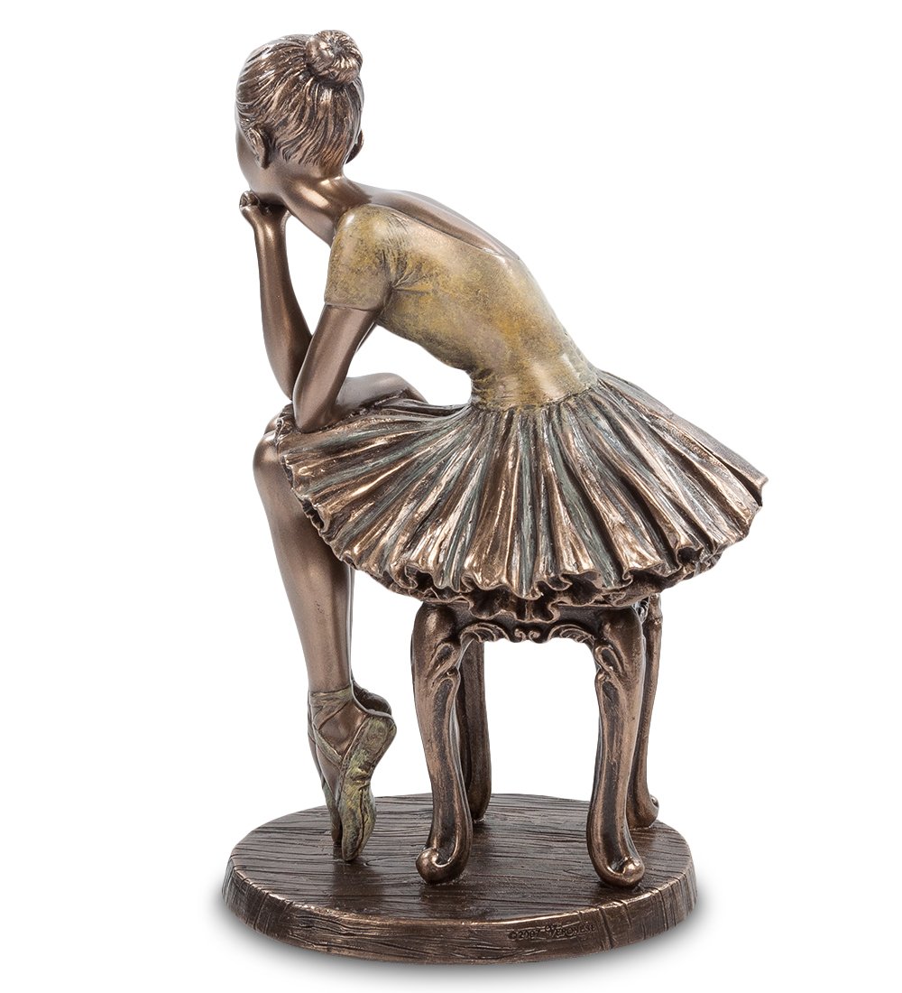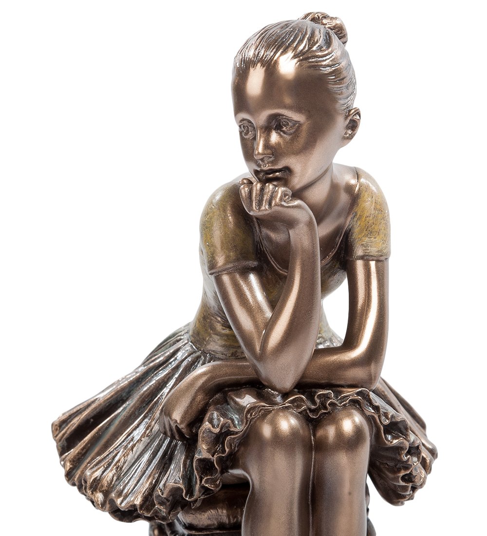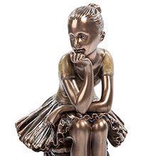Небольшая статуэтка «Юная балерина» рассказывает о нелегких буднях девочек, решивших посвятить себя большому искусству балета. Хрупкое юное создание скромно пристроилось на старинной табуретке, и мечтательно смотрит вдаль, отдыхая после тренировки и думая о будущем успехе. На девочке классический наряд балерины: пачка, пуанты и легкая футболка.