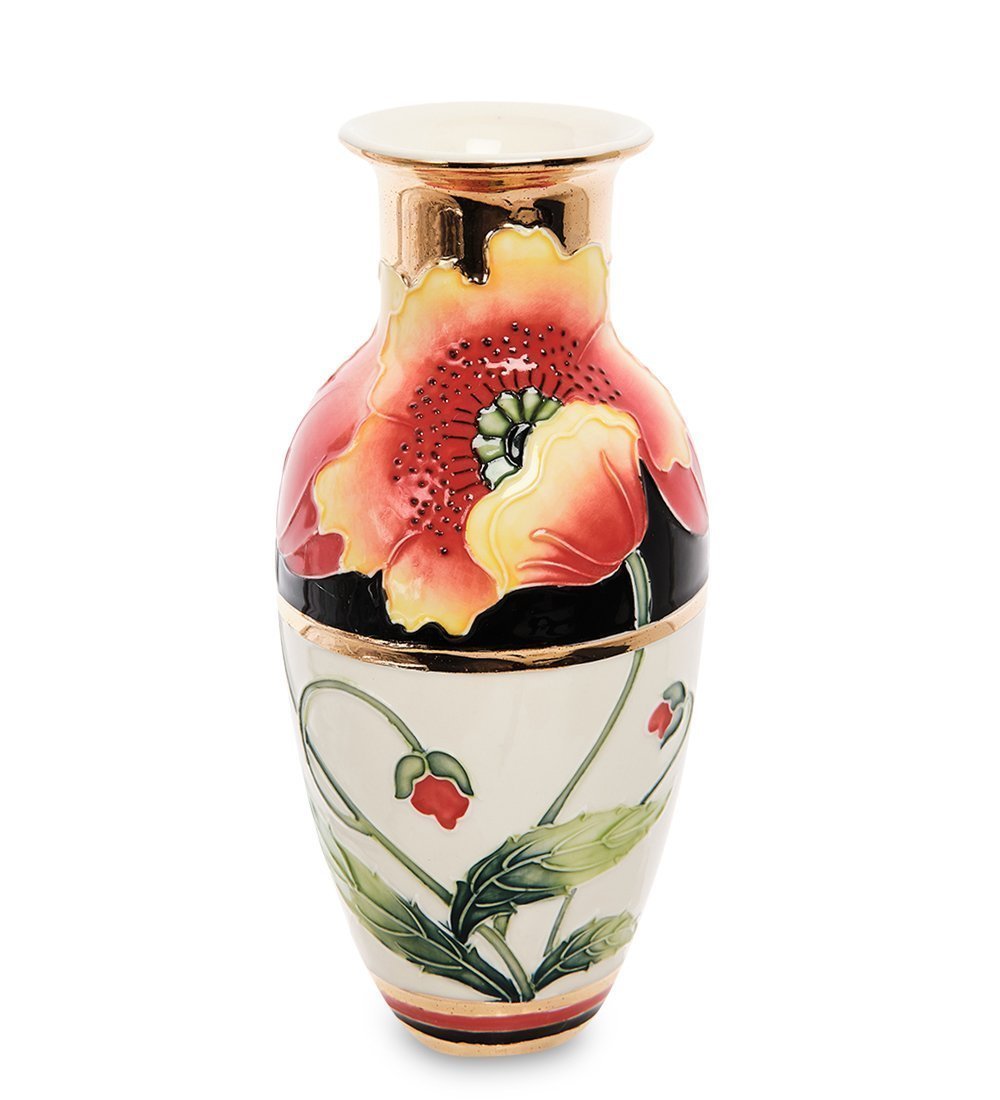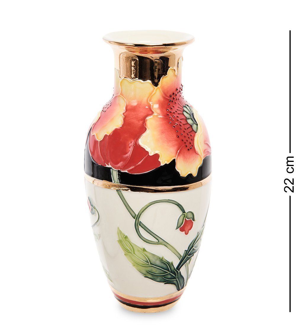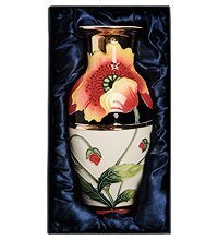 22-сантиметровая фарфоровая ваза из коллекции Pavone – предмет, которым можно украсить одну из комнат в квартире, но еще лучше ваза будет смотреться на даче или в загородном доме. Она покрашена в фиолетовый цвет, а на фиолетовый фон нанесен рисунок в виде черной сетки, разноцветных бутонов и зеленых листьев на бежевых стеблях.