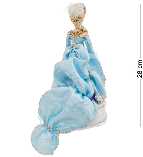 Кукла украшена бисером, кружевом, бантами и стразами. Личико из бисквитного фарфора разрисовано акриловыми красками, а именно голубые глаза, нежно-розоватые губки и яркий румянец на щеках. Одеяния будто обшиты золотом, пошиты из атласа и дорогих тканей. Высокий турнюр делает эту куклу особенной среди всей вашей коллекции, а аккуратно уложенные волосы подскажут вам о высоком происхождении дамы.