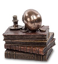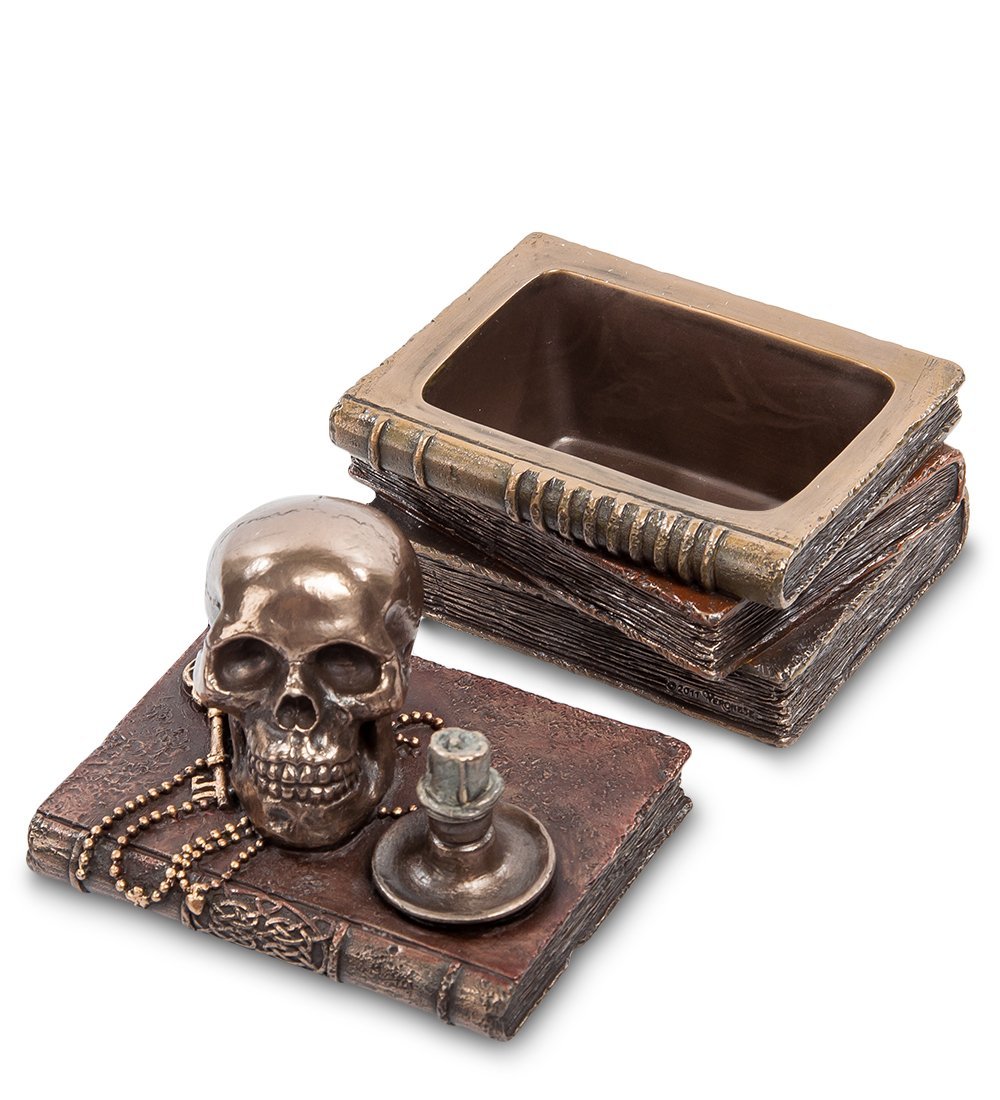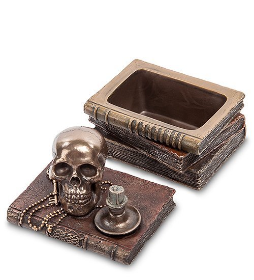 Шкатулка выполнена в виде нескольких старинных книг, на стопке которых расположен старинный ключ на металлической цепочке, подсвечник с огарком свечи и человеческий череп. Все эти предметы несомненно являются ключом к страшной тайне, которую вам скоро посчастливится разгадать. Возможно, у вас уже есть тайна, о которой не обязательно знать окружающим; попробуйте доверить ее шкатулке «Тайные знания», или приобретите необычный предмет для кого-нибудь из друзей, любящих конспирологию и увлеченно разгадывающих загадки истории.