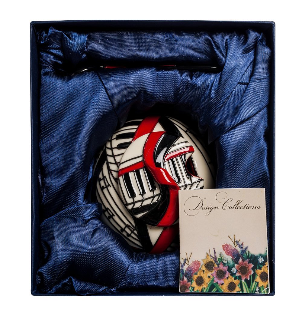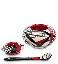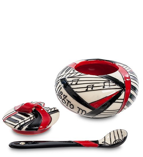 Эта сахарница – прекрасный подарок для музыканта. Особенно для играющего на фортепиано. По всей поверхности посуды переплетаются узоры из черно-белых клавиш и нотных станов, усеянных нотами. И все это переплетено красной лентой, на крышке выходящей в пространство и образующей ручку, за которую эту крышку удобно снимать. В комплект входит такая же по стилистике ложка для сахара. Когда она в сахарнице, специальная прорезь в крышке позволяет ей плотно закрываться. Общая ложка удобна – не придется каждому участнику чаепития тянуться за сахаром со своей ложкой. Такую сахарницу оценит и пианист, и композитор.