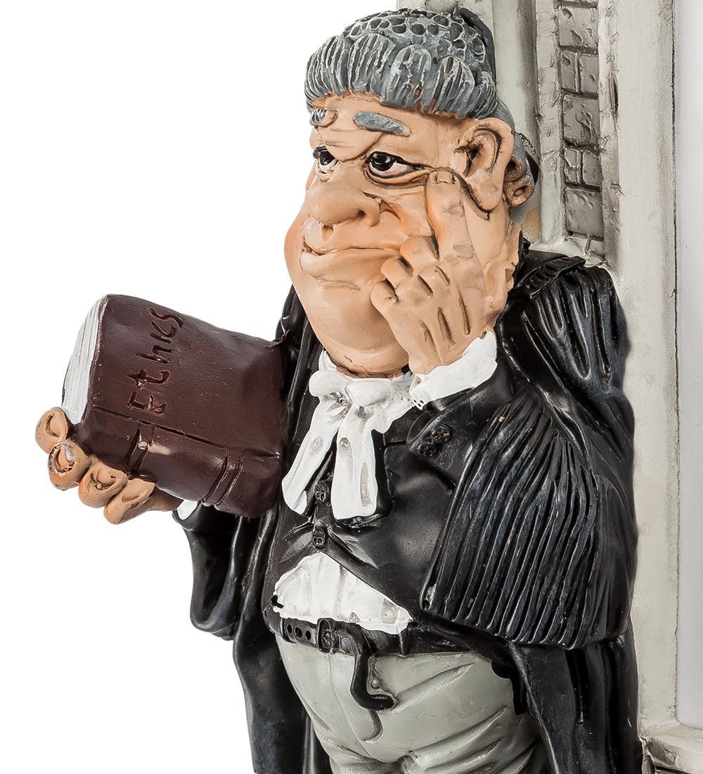 Наверно, о том, кто изображен на снимке. В рамку желательно вставить снимок молодого начинающего юриста, тогда композиция будет выглядеть законченной. Такие маленькие статуэтки способны хорошо сочетаться с фотографией, вставленной в рамку. Раздобудьте фотографию выпускника юрфака и вручите ему в рамке ко дню получения диплома.