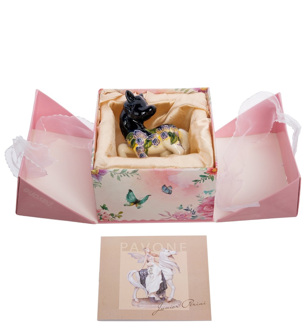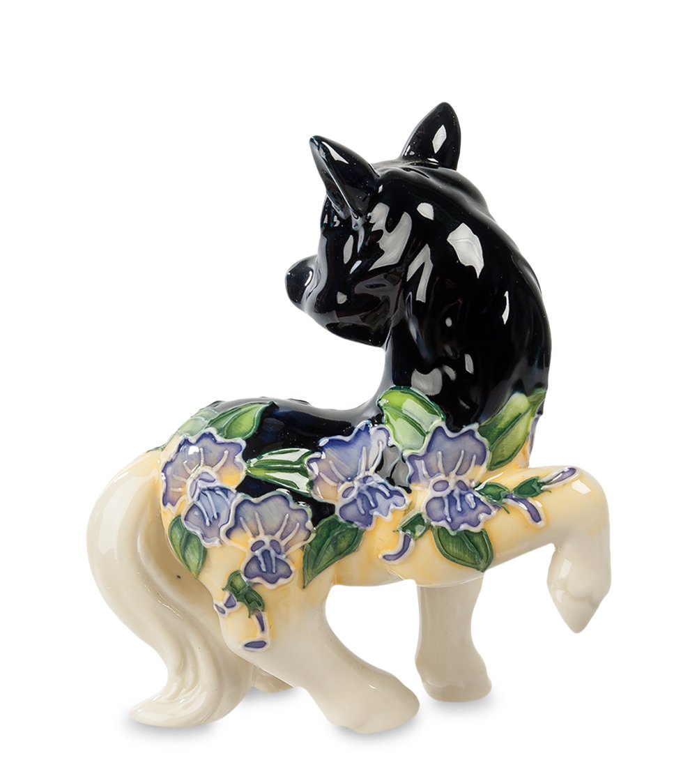 Непревзойдённая фигурка "Лошадка Глициния" символизирует грациозность и разум животных. Фарфоровое изделие выполнено в чёрно-белых тонах и расписано потрясающими цветочными узорами. Нетрадиционное оформление статуэтки будет оригинально смотреться в любом помещении. Лошадка излучает добро и позитив. Понравится и старшим, и младшим членам семейств.