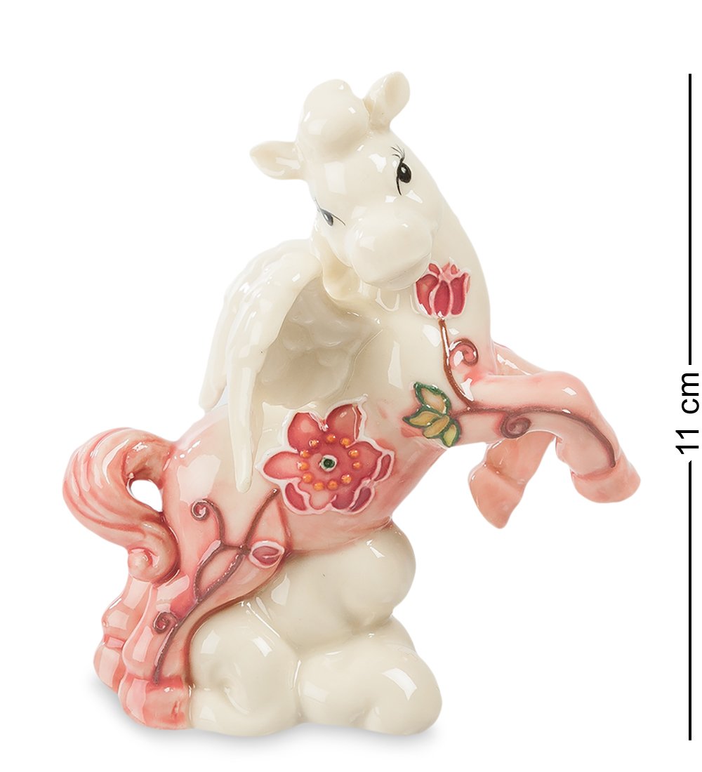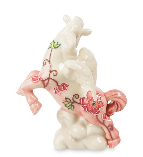 Как и все ангелы, лошадка-ангелочек живет в облаках: в их форме создатели статуэтки выполнили подставку. Лошадка любит скакать, и даже отсутствие земной твердыни под копытами не мешает ей веселиться: небесное животное совершает прыжок, стоя на задних ногах и пытаясь перепрыгнуть невидимую преграду. У лошадки белая грива и розовый хвост. Розовым цветом также покрашены все четыре ноги ангельского создания, а на розовый фон нанесено изображение цветов на длинных фиолетовых стеблях – вероятнее всего, ими засеян лошадиный рай.