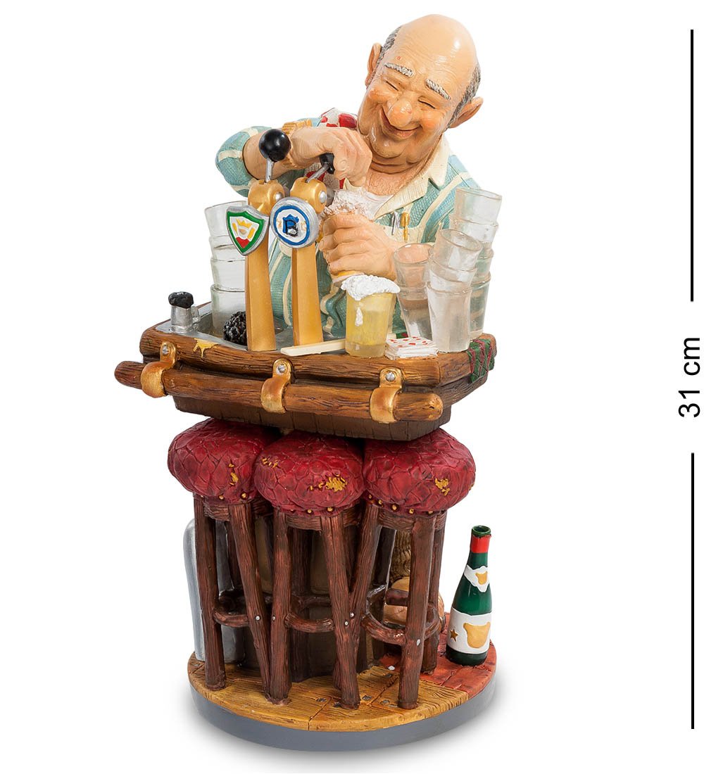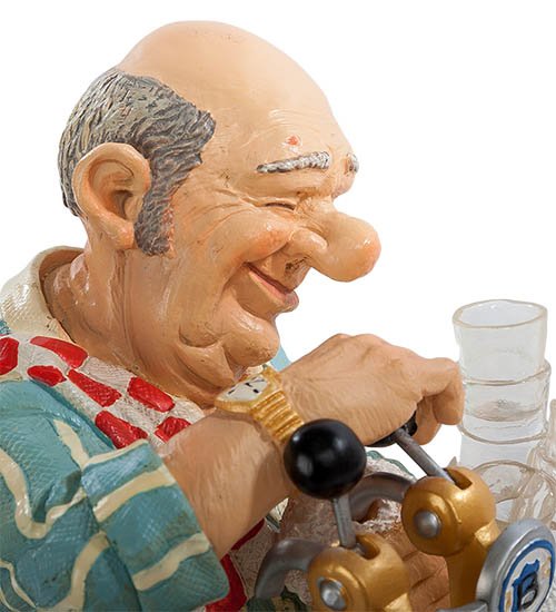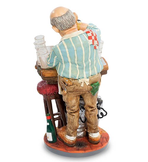 Забавная фигурка "Бармен" явно была создана дизайнерами с чувством юмора! Невероятный заряд позитива исходит от этого жизнерадостного персонажа! Благодаря таланту мастеров, искусной проработке деталей и цветовому решению, перед нами открывается целая картина. Посмотрите, как весело смеется над очередной историей этот мастер своего дела, как удивительно точно проработаны черты его доброго, уже немолодого лица.