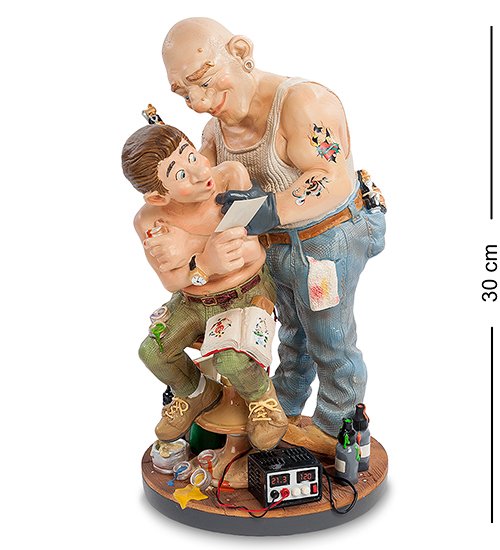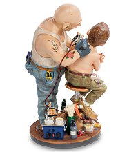 Забавная статуэтка татуировщика, занятого процессом нанесения татуировки на юное неокрепшее тело. Здоровый и добродушный дядька сжал плечо юнца, которому и больно, и интересно - как же оно будет выглядеть, сердечко, вытатуированное у него на лопатке. Блокнот с рисунками, личный пример татуировщика - все для вас дорогие посетители тату-салона. Оригинальная фигурка мастера татушек станет хорошим подарком для ваших друзей и знакомых, кто так или иначе связан с таким увлечением.