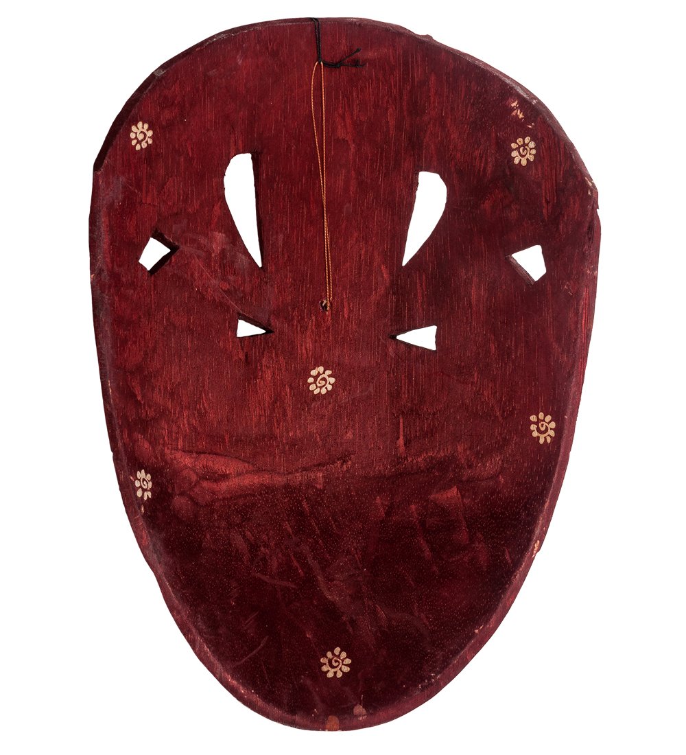 На багровом фоне полотна точками и линиями нанесено изображение женского лица в высоком головном уборе. Лицо разукрашено цветами и узорами, а головной убор, напоминающий корону египетского фараона, украшен многочисленными линиями, образующими необычный геометрический рисунок. При этом в верхней части маски имеется два отверстия; возможно, ее все-таки можно носить?
