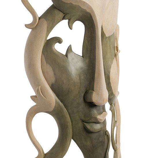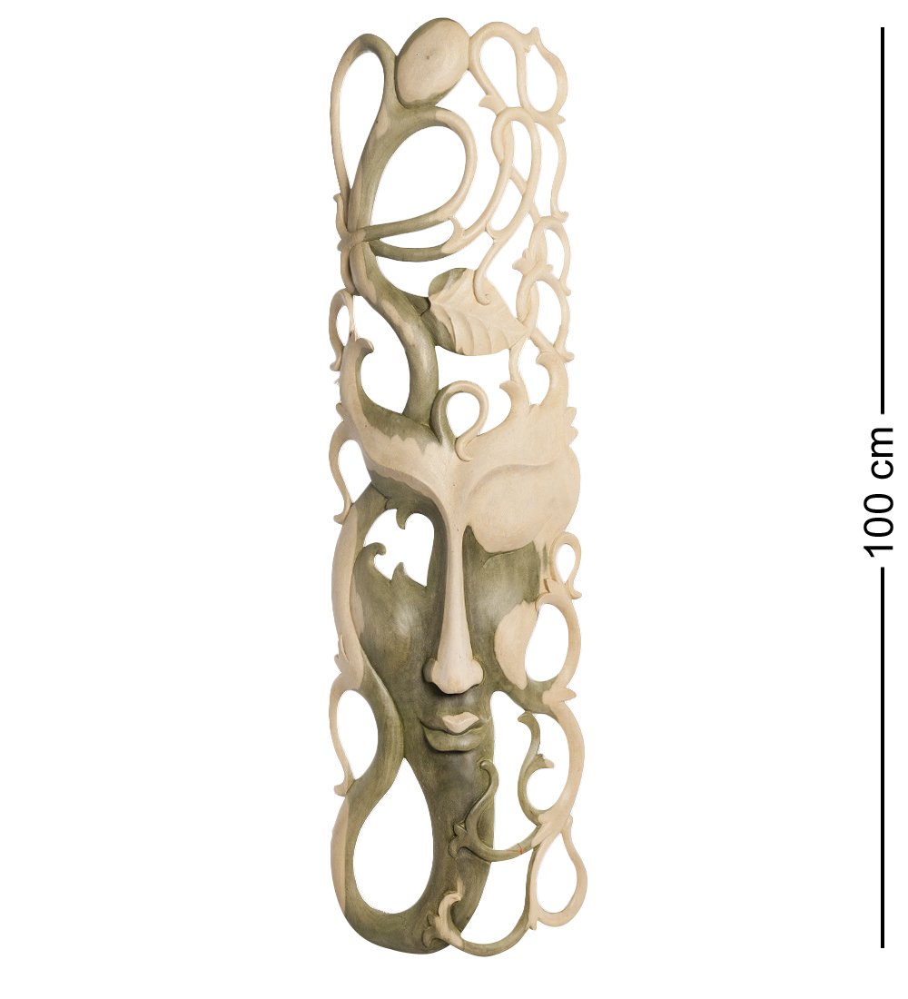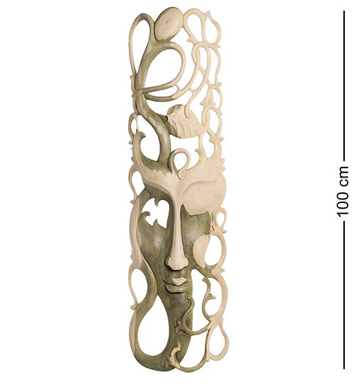 Маска сделана из дерева светлой расцветки. Примерно треть ее площади занимает женское лицо, из которого в разные стороны растут побеги Ипомеи, а также абстрактный мужчина, орган которого стыдливо прикрыт листочком. Интересно, что и женское лицо, и мужчина с листочком соединены единым стеблем, как и другие элементы, в расположении и изображении которых заложен глубокий смысл.