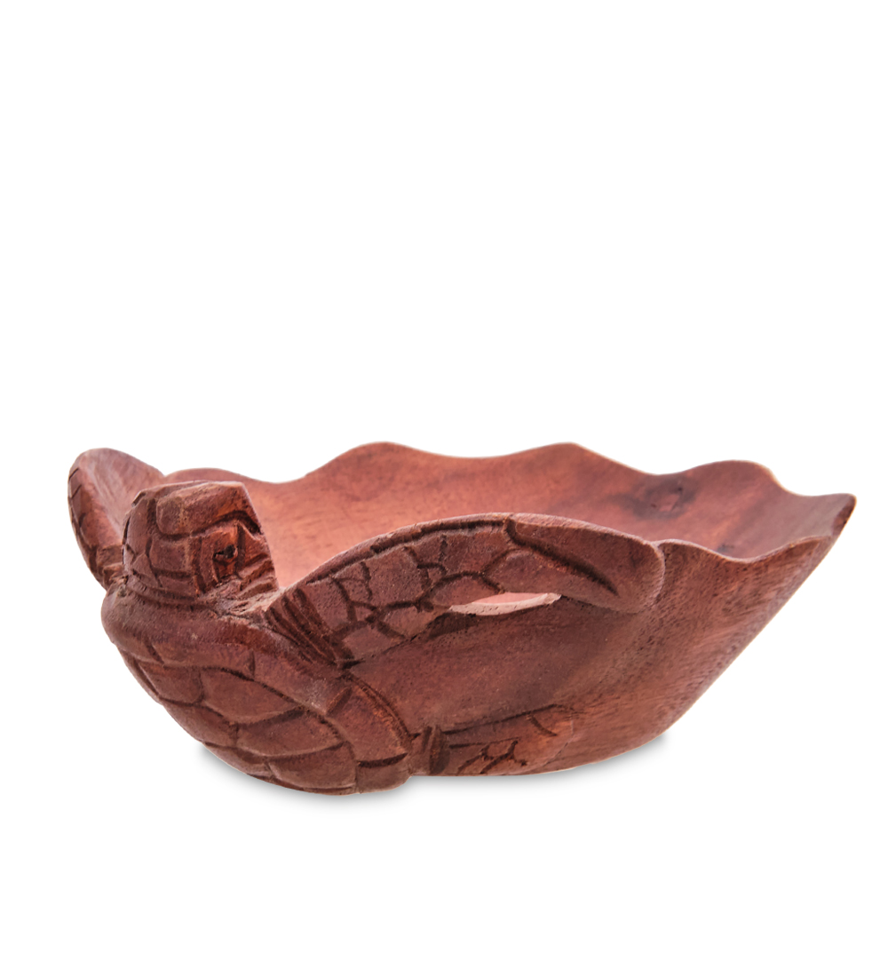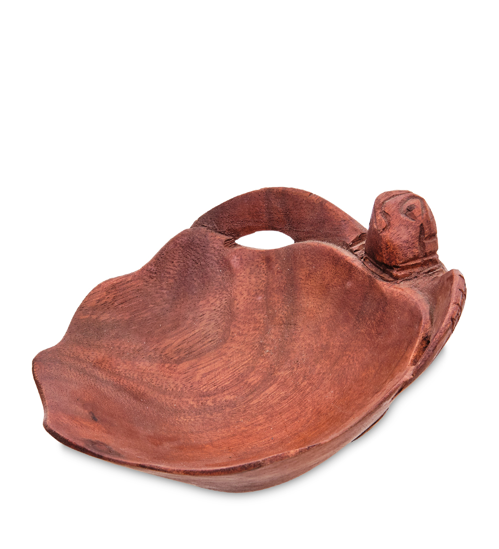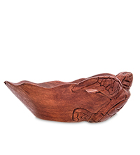 Небольшое, 15-сантиметровое блюдо «Черепаха» сделано из темного дерева. Формой и оформлением блюдо действительно похоже на черепаху, перевернутую вверх ногами, так как само блюдо сделано в форме большого панциря. Правая сторона блюда украшена резной ручкой, оформленной в виде головы животного и двух длинных ластообразных лап.