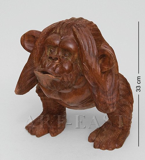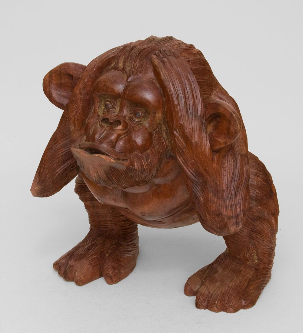 Обезьяна сделана из в Индонезии дерева породы суар и имеет высоту 30 сантиметров. Индонезийская обезьяна выглядит так же, как обезьяны, живущие в российских зоопарках: она коренаста, мускулиста, и уверенно держится на толстых коротких задних лапах. Ее уши забавно оттопырены (это знак хорошего слуха), и, вероятно, обезьяне приходится прикладывать значительные усилия, чтобы избавить себя от лишней информации.