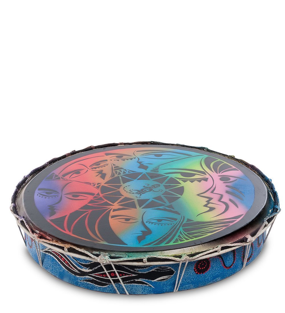 Наш бубен не похож на бубен из красного уголка сельской школы. Он прекрасно оформлен и переливается всеми цветами радуги. На поверхности изображены забавные рожицы (скорее всего, это шаржи на известных индонезийских музыкантов). Поверхность бубна имеет черный фон, а основа инструмента – серо-голубая. Бубен имеет круглую форму, а диаметр музыкального инструмента составляет 42 сантиметра.