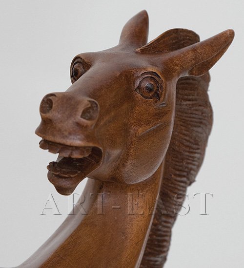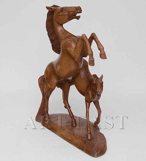 Фигурки лошадей вырезаны из дерева на индонезийском острове Бали. Скакуны располагаются на подставке, высота композиции вместе с подставкой – 50 сантиметров. Для создания лошадей резчики использовали темное дерево; конь окрашен в темно-коричневый, шоколадный цвет, а кобылица – в светло-бежевый.