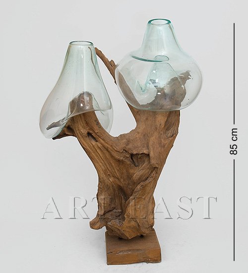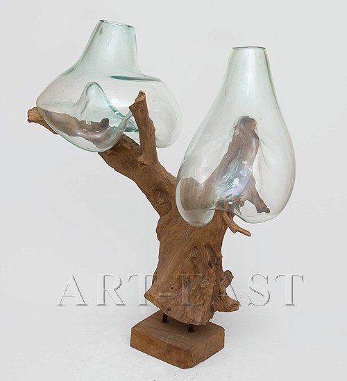 Интересная ваза с острова Бали, немного напоминающая абстрактную скульптуру и необычный подсвечник, сделана из необработанного дерева и двух стеклянных колб необычной формы. Многие, увидев подобный предмет впервые, вряд ли догадаются о его предназначении, посчитав вазу композицией скульптора-авангардиста.