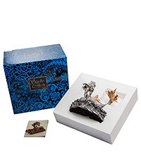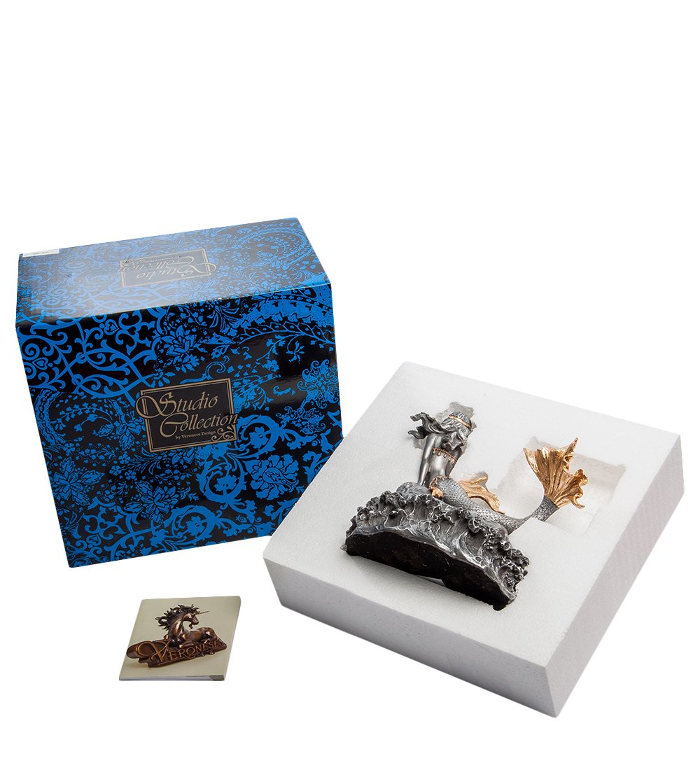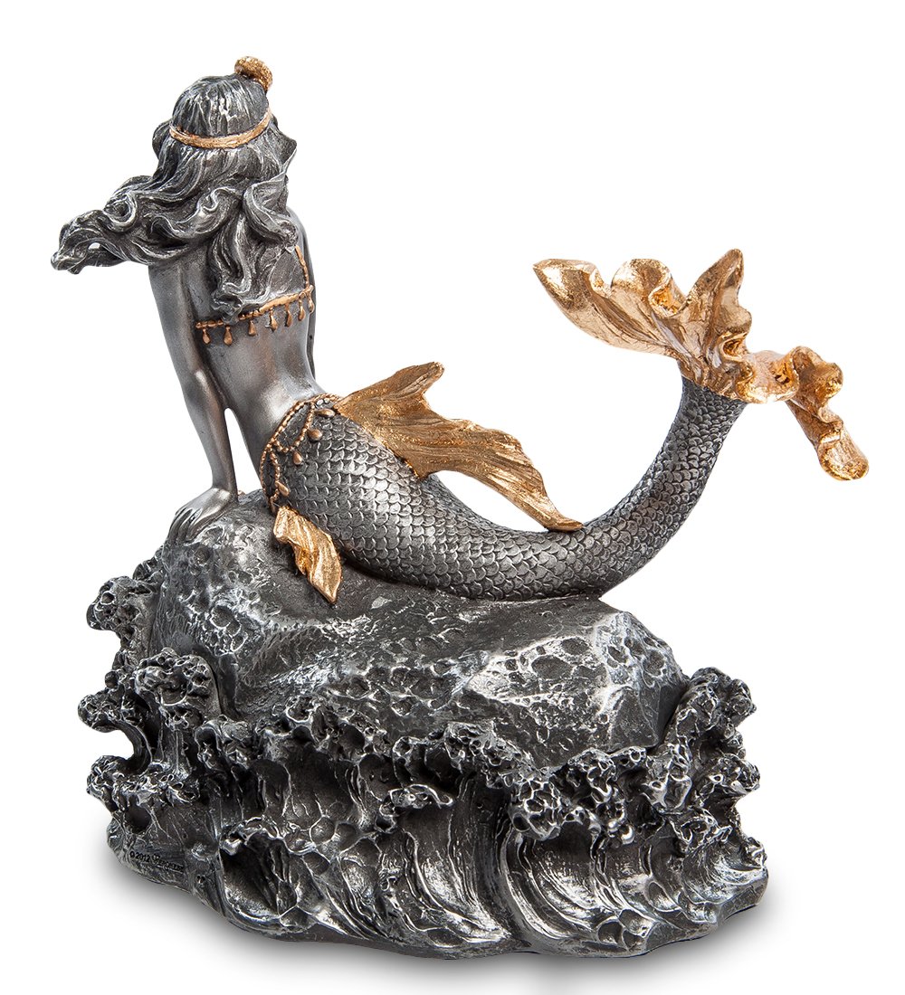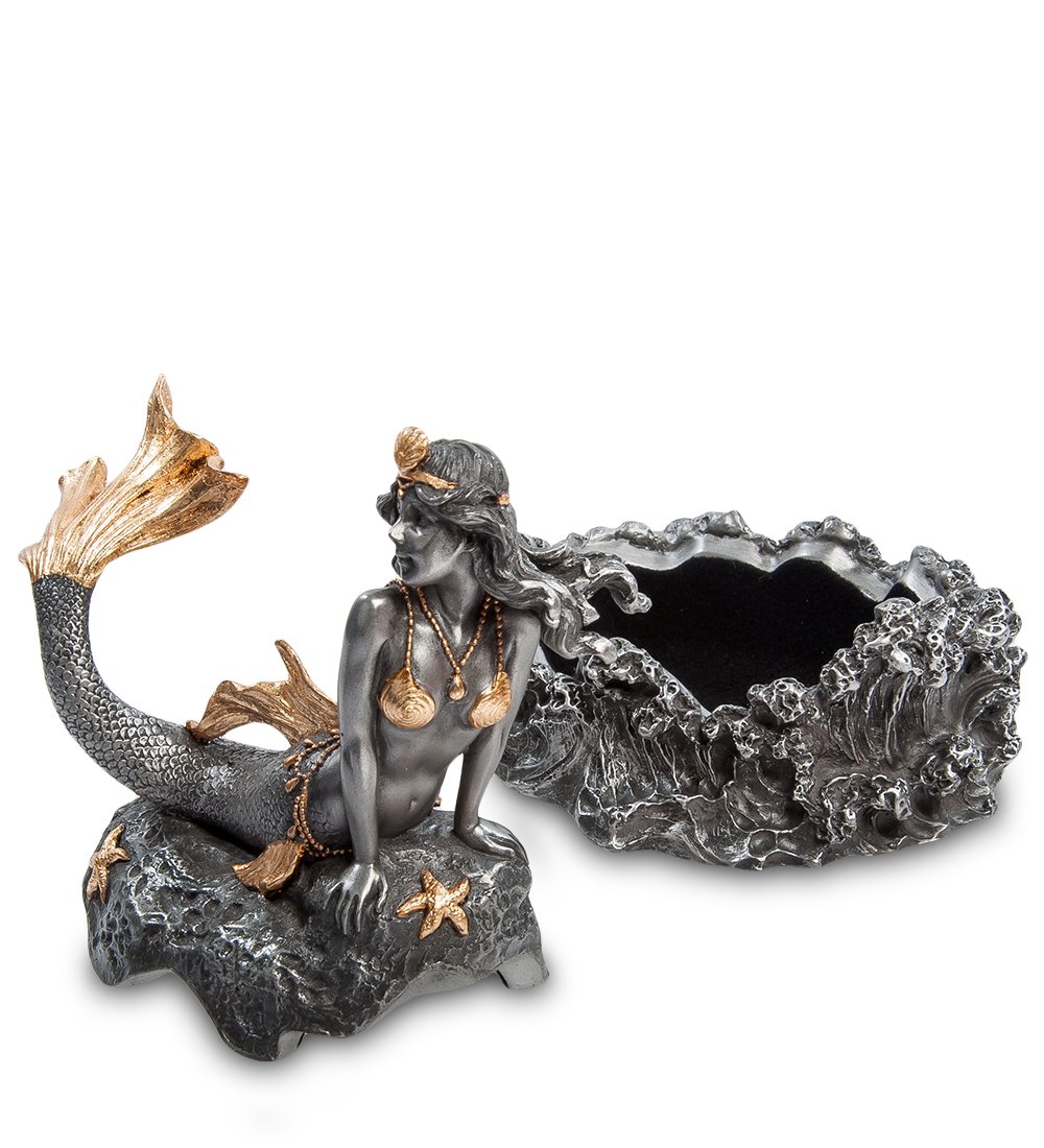 Русалка с длинным рыбьим хвостом, украшенным позолотой, пристроилась на большом прибрежном камне; вокруг бушует море, а девушка смотрит вдаль – на берег, где гуляют люди с человеческими ногами, и где живет ее возлюбленный, которого она спасла от смерти. Вероятнее всего, именно эту сценку из сказки Г-Х Андерсена изобразили создатели необычной шкатулки из темно-серого полистоуна под серебро с золотом.