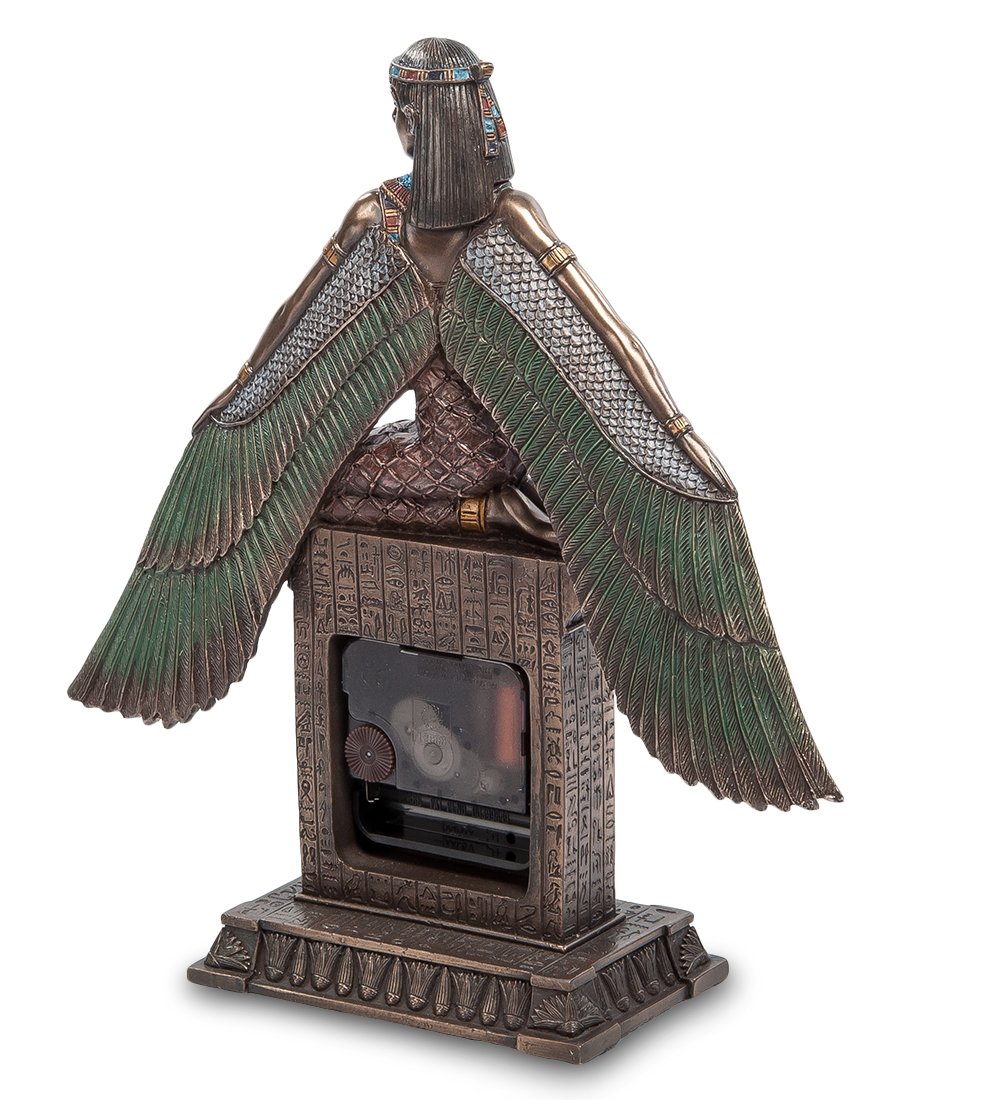 На сей раз богиня оседлала часы кубической формы: к ее рукам приделаны искусственные крылья из сине-зеленого материала, а голова повернута направо (смотрящий на часы будет видеть ее профиль). Как и большинство дам, обитающих в дневнеегипетской мифологии, Исида женственная и обладает стройной, изящной фигурой.