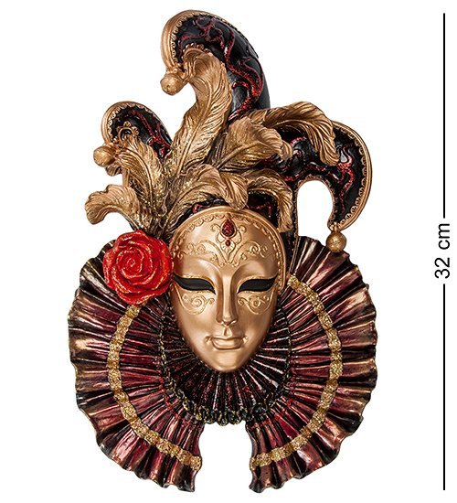 Венецианская маска «Шут» идеально подходит для украшения стены комнаты, обставленной в классическом стиле. Маска сделана из цветного полистоуна; в ее цветовой гамме преобладают бежевые и золотистые оттенки. Лицо маски бронзового цвета украшает большая красная роза, расположенная у правого виска, разноцветный шутовской колпак с бубенцами частично заслоняют перья золотистого цвета. Лицо окружено красным плиссированным декоративным элементом одежды, который был частью придворных нарядов 500 лет назад. Лицо маски, украшенное красным сверкающим камнем, выглядит таинственно.