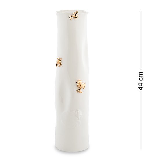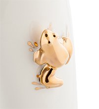На фоне ее белой глянцевой поверхности красота каждого цветка будет смотреться еще более ярко и выразительно. Однако дизайнерская оригинальность этой вазы проявляется в ее украшениях, выполненных в виде золотистых лягушек, которые отважно ползут по поверхности изделия, надеясь прикоснуться к ароматному букету.