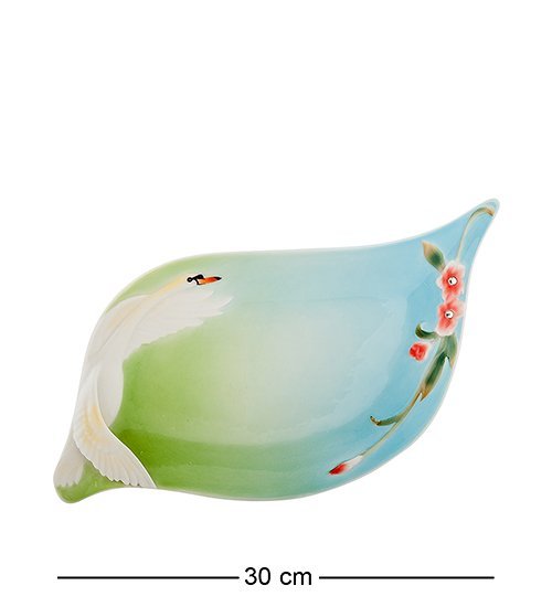 Первое, что бросается в глаза при взгляде на это уникальное изделие — его форма. Словно застывшее в полете лебединое крыло предстает перед нами это блюдо «Лебеди». Мягкий и нежный узор усиливает впечатление: мы видим распластавшегося в полете белоснежного лебедя и проносящуюся под ним прекрасную землю с зеленью, цветами.