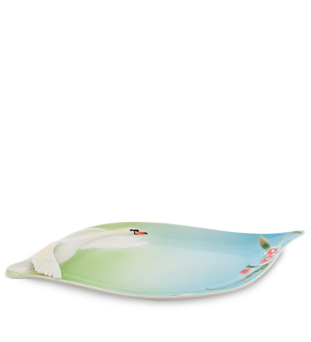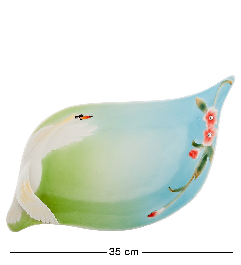 В этом изделии прекрасно все — и картина, которая помещена в блюде и представляет собой целый сюжет про парящего в синем небе белоснежного лебедя; и форма блюда, напоминающая лебединое крыло, такая же изящная и на первый взгляд хрупкая. Блюдо завораживает, заставляя погружаться в этот удивительный мир нежности, стремительности полета, бесконечной красоты природы.