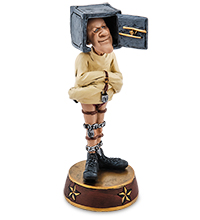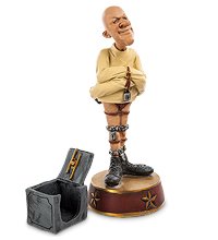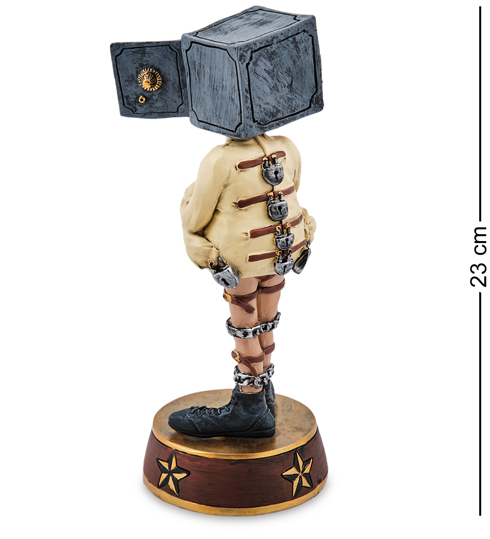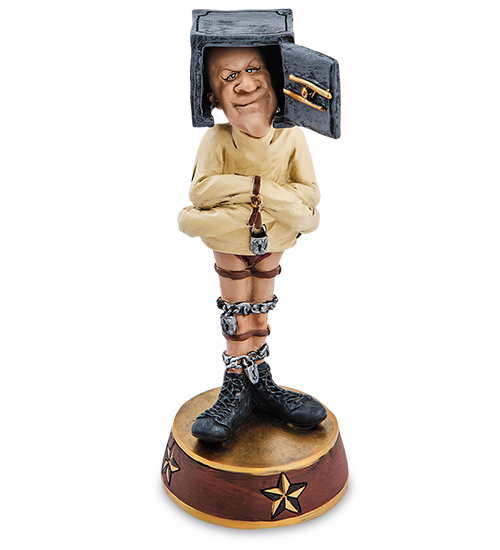 Шуточная статуэтка фокусника. Этот фокусник, самый знаменитый в истории иллюзии, прославился тем, что умел мгновенно освобождаться из любых пут, наручников и даже смирительных рубашек. Вот он готов к очередному номеру, у него связаны руки и ноги, весь он обвешан замками, а голова помещена в сейф. Осталось захлопнуть дверцу сейфа и сбросить этого самоубийцу в воду.