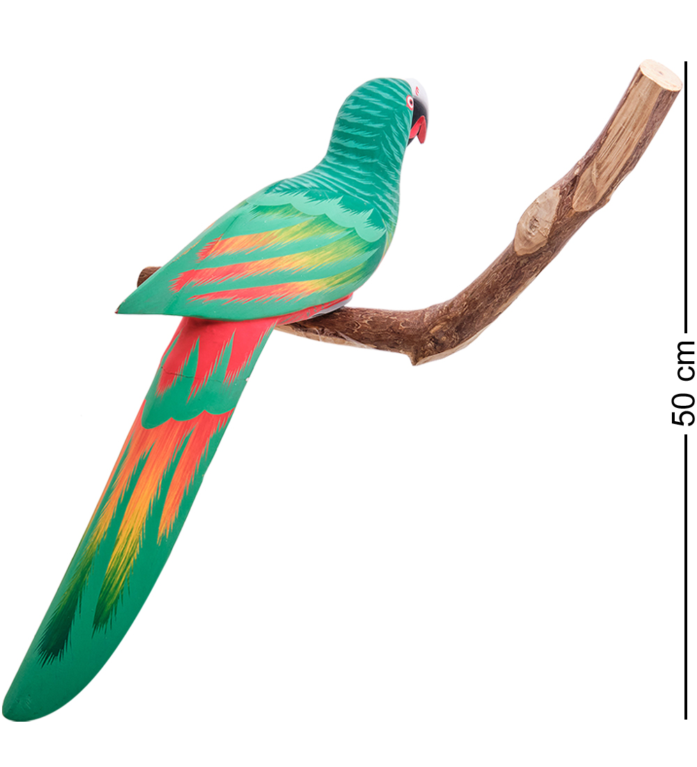 Жердочка попугая действительно является веткой, слегка очищенной от коры, сучков и листьев. Птица-попугай раскрашена ярко: помимо зеленого цвета, художники добавили к хвосту и крыльям немного переливающихся полос. У попугая длинный хвост и черно-белый клюв, который слегка приоткрыт. Глаза и клюв птицы говорят о том, что попугай удивлен происходящим вокруг. Если вы поставите его при входе в квартиру, гости будут удивлены реакцией попугая на свое появление.