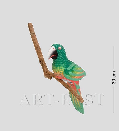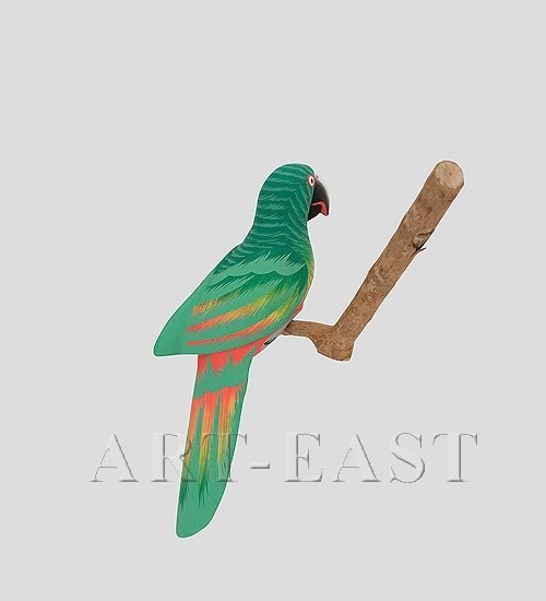 О жердочке стоит сказать особо: она действительно в точности похожа на ветку тропического дерева, на которых так любят сидеть попугаи, туканы и другие экзотические птицы. Индонезийский попугай раскрашен цветами зеленых оттенков; на крылья, живот и хвост птицы художники добавили немного красных и оранжевых линий. У попугая черно-белый клюв с красной полоской, цветом напоминающую губную помаду, и небольшие черные глаза с красным ободком.
