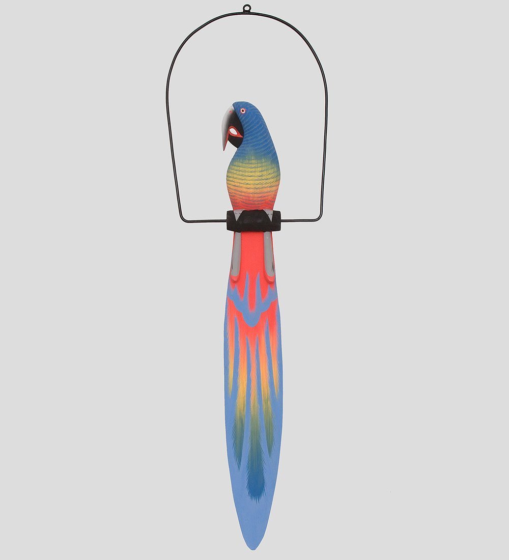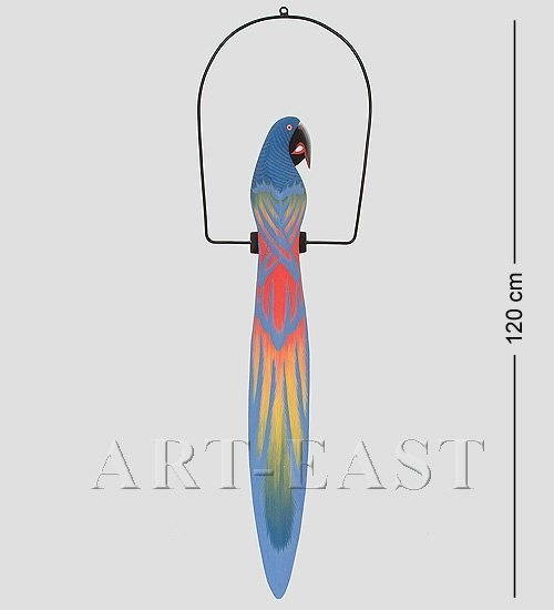 Большинство попугаев, которых нам доводилось видеть, не похожи на статуэтку «Попугай на жердочке». Главное отличие статуэтки – длинный хвост, формой напоминающий старинный меч. Статуэтка изготовлена из дерева; над ней поработали мастера Индонезии. Ее длина – 100 сантиметров вместе с металлической жердочкой, форма которой напоминает полукруглое французское окно.