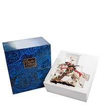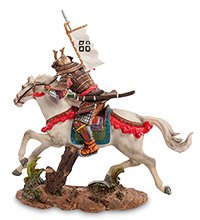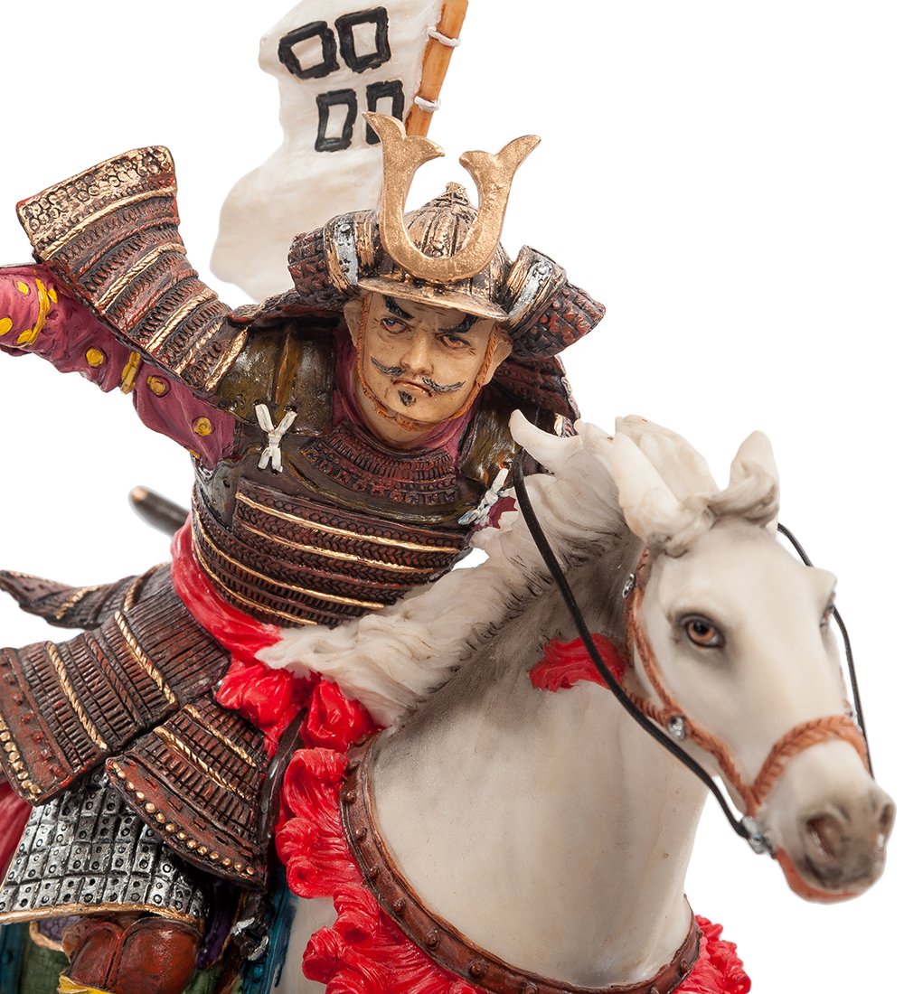 Фигурка «Самурай на коне» демонстрирует японского воина, вооруженного классическим самурайским мечом и одетого в прочные латы. На его голове – шляпа необычной формы с большим позолоченным символом, напоминающим формой подкову, за спиной – белое знамя. В отличие от известных нам современных самураев, передвигающихся пешком или на мотоциклах, наш герой оседлал белого коня и мчится атаковать врага. Под копытами лошади – чей-то меч и щит; битва в самом разгаре.