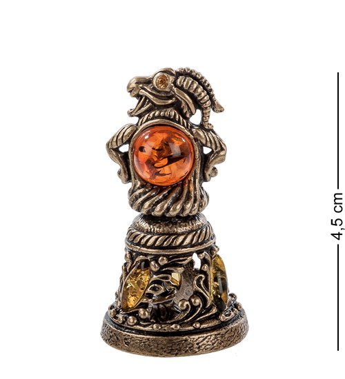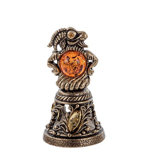 Колокольчик из латуни, ручка которого выполнена в виде козла – симпатичная безделушка, которая может пригодиться в квартире и которую можно подарить другу по поводу и без. Маленький колокол, расположенный внизу, оформлен резьбой и имеет язычок: если потрясти колокольчик, он начнет звонить, и, возможно, на шум придет тот, кто вам нужен. Поверхность стенок напоминает резное панно: на них изображены цветы, украшенные овальными янтарными капельками желтого цвета.