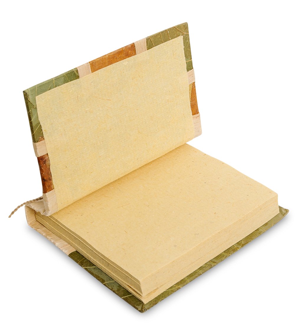 В блокноте "Яркие моменты" 50 листов писчей бумаги размером 10*12 см, скрепленных пальмовой нитью с простым карандашом.